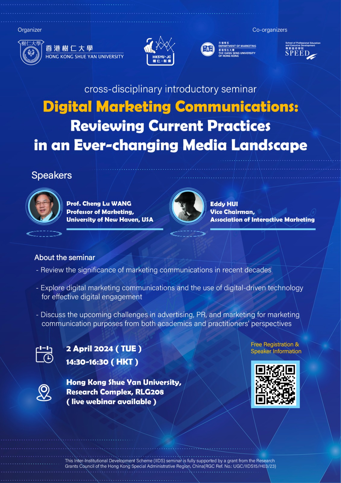 項目主理人、仁大新傳系副系主任、助理教授唐淑莊表示,今次講座是研究資助局(UGC)撥款資助的「數碼營銷傳播的回顧及未來研究方向:學界與業界的跨學科對談」項目計劃的首場活動,旨在回顧數碼營銷傳播在過去數十年的發展,探討數碼科技如何影響數碼參與的有效性,並從理論及專業應用的角度展望公關、廣告和市場營銷範疇在未來將會遇到的新挑戰。