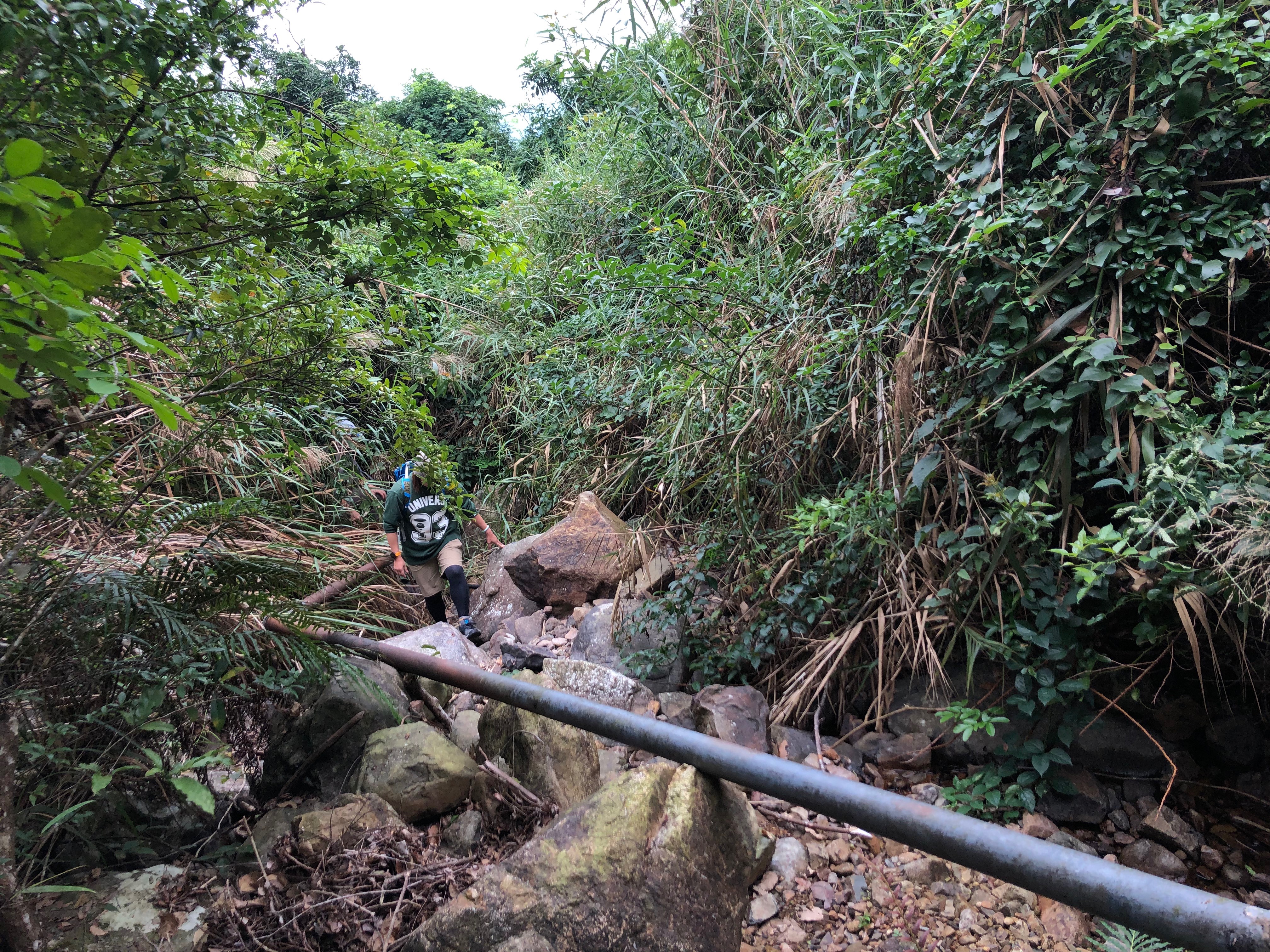 繼續上溯,先抵「靈象石河」,無數大石堆疊在山坡上,前行需要特別小心。早前可能受強颱風山竹影響,眼見不少大樹連根拔起,令原本明顯的山路都被截斷了。