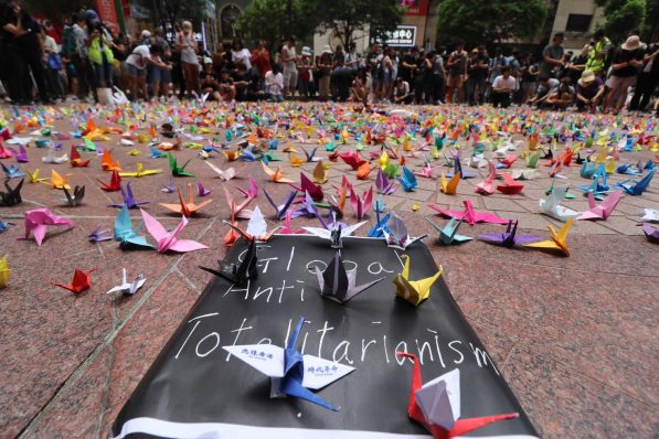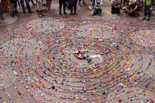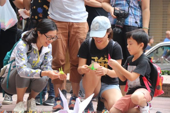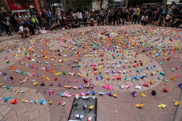 市民下午 (29日) 在銅鑼灣時代廣場外擺彩色紙鶴陣表達政治訴求,紙鶴印有「反送中」運動的口號,包括「光復香港,時代革命」及「五大訴求,缺一不可」。