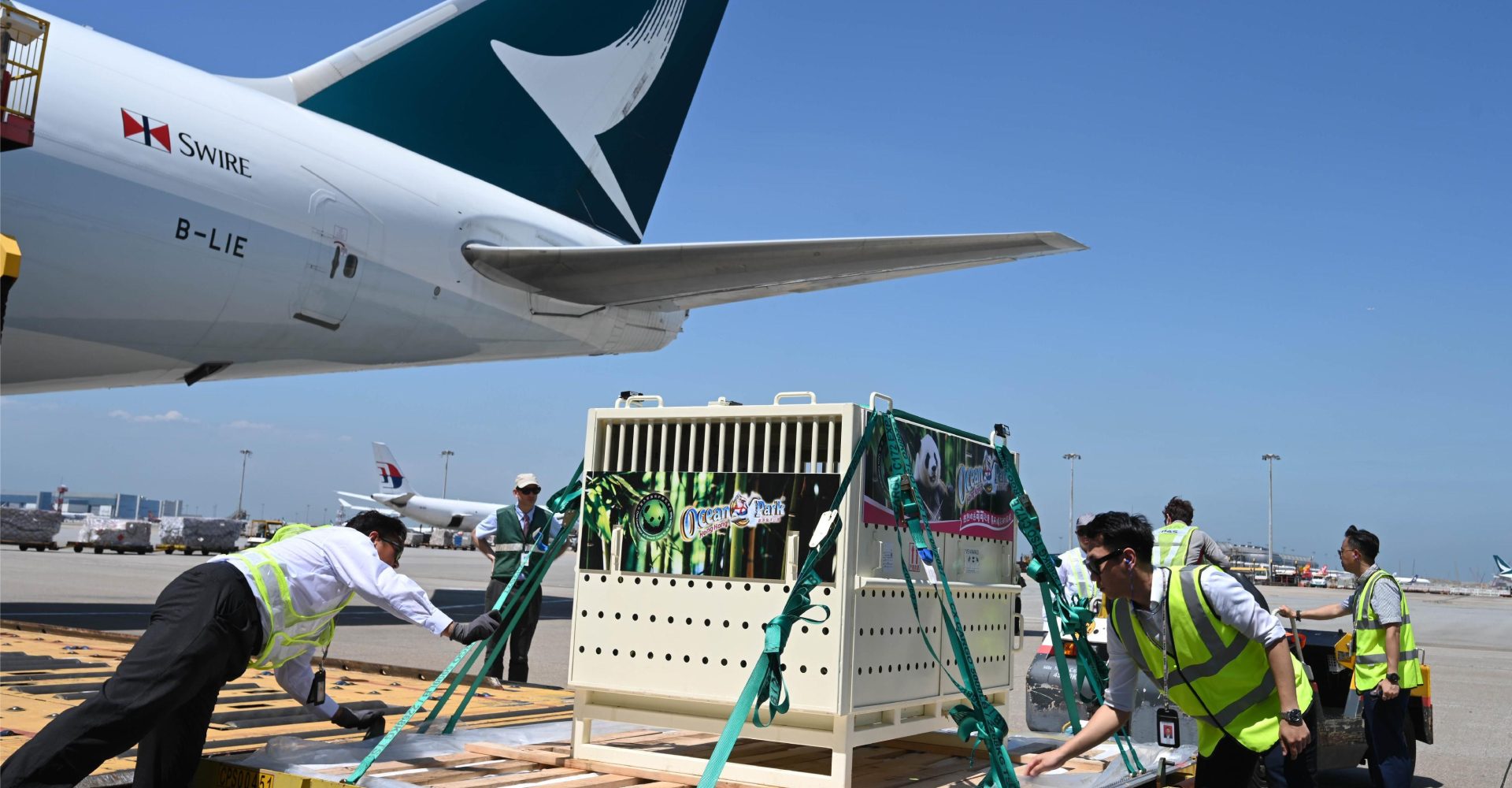 陳國基亦感謝國泰貨運安排及贊助大熊貓從四川到香港海洋公園的整個運輸過程;並感謝香港賽馬會慈善信託基金贊助改善大熊貓在海洋公園的新居設施,以及資助有關大熊貓的保育教育工作。