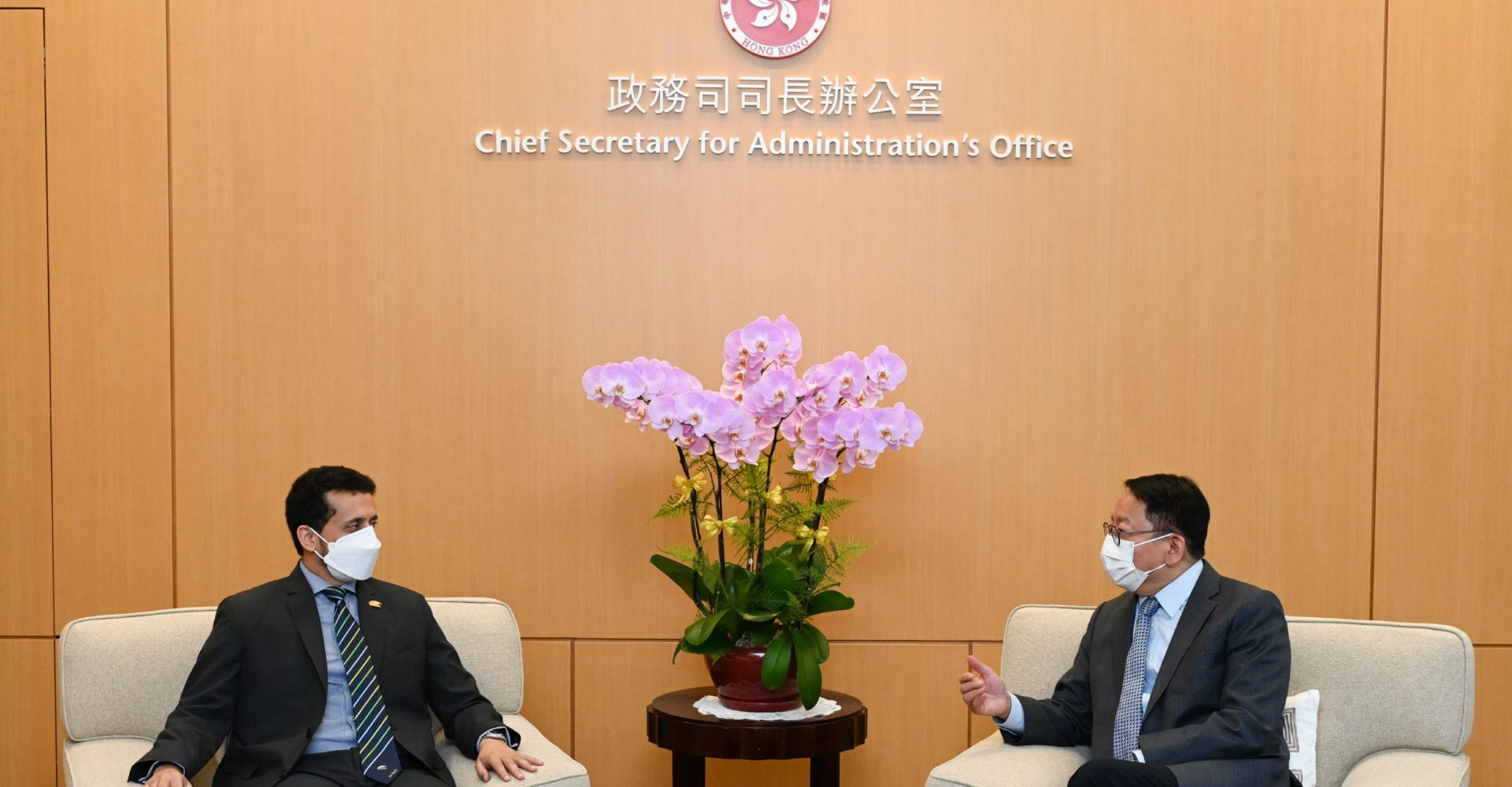 封面圖片:政務司司長陳國基(右)今午接見亞洲橄欖球總會會長Qais Abdulla Al Dhalai(左)。