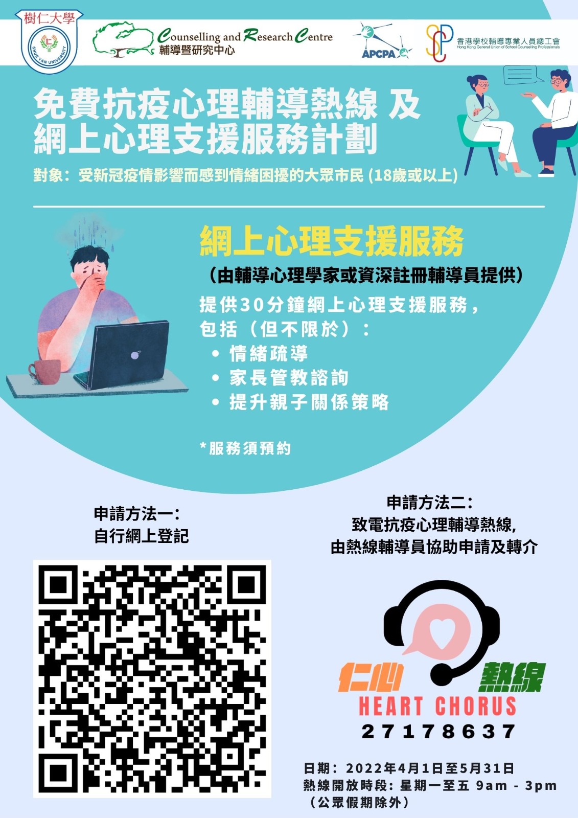 香港樹仁大學輔導暨研究中心推出抗疫心理輔導熱線「仁心熱線」以及網上心理支援服務,免費支援受疫情影響而感到情緒困擾的市民。