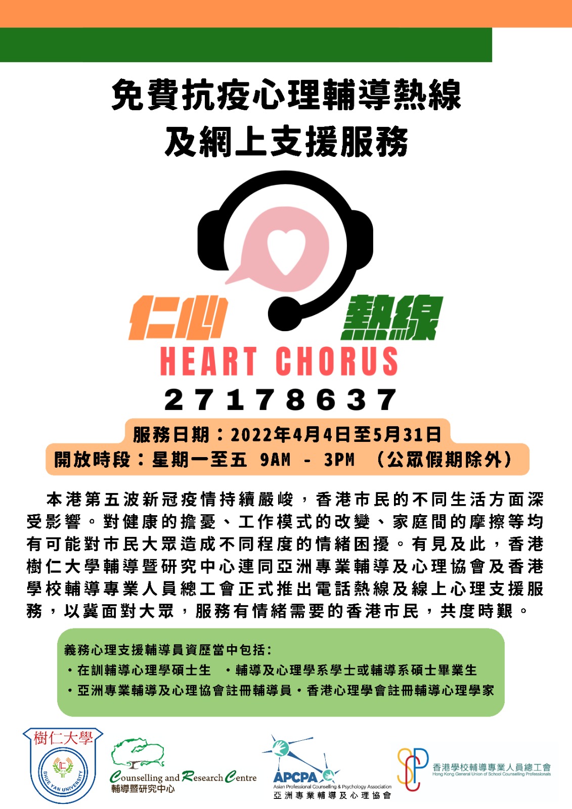 香港樹仁大學輔導暨研究中心推出的抗疫心理輔導熱線「仁心熱線」及網上心理支援服務,合作夥伴包括亞洲專業輔導及心理協會,以及香港學校輔導專業人員總工會。 計劃包括電話熱線服務及網上心理支援服務兩部份,提供情緒疏導、家長管教諮詢、提升親子關係策略、疏導DSE考生壓力等服務。