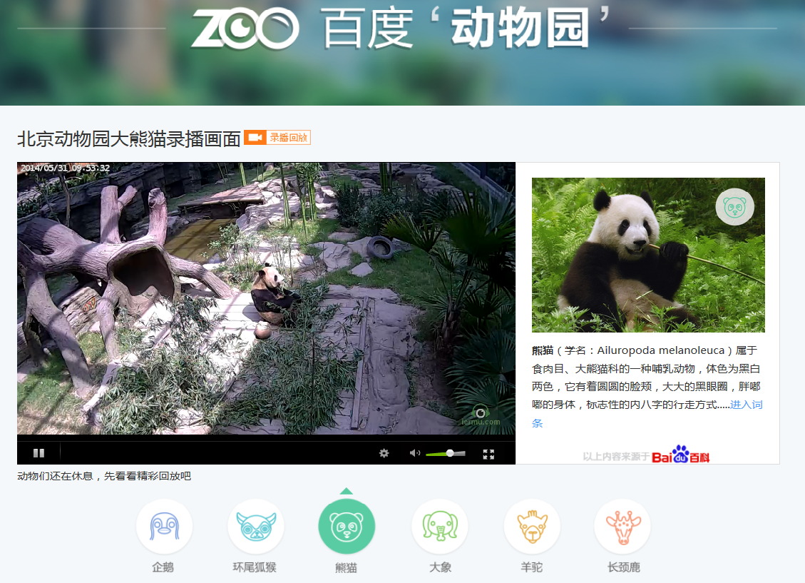 為迎接六一國際兒童節,百度與全中國最大最多動物的北京動物園合作,推出百度動物園(http://baike.baidu.com/zoo)。 6月1日至7日的早上9時至下午5時,網站會直播企鵝、熊貓、大象、長頸鹿、環尾狐猴、羊駝的一舉一動,讓全國大人小朋友可以通過手機或電腦觀看,彷如親身參觀北京動物園。