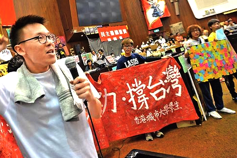 5名學生中,3名來自城大及2名來自中大,把連日在校園收集到的簽名和打氣語句帶到立法院議事廳,交予總指揮林飛帆,獲現場學生熱烈掌聲。城大中文翻譯及語言學系學生黃治立在台上說,早前《明報》前總編輯劉進圖遇襲,台灣學生即聲援反暴力,作為香港學生,亦譴責日前台灣警察粗暴對待佔領行政院的學生, 「我們一定反對暴力,無可能用這樣方式對待學生!」