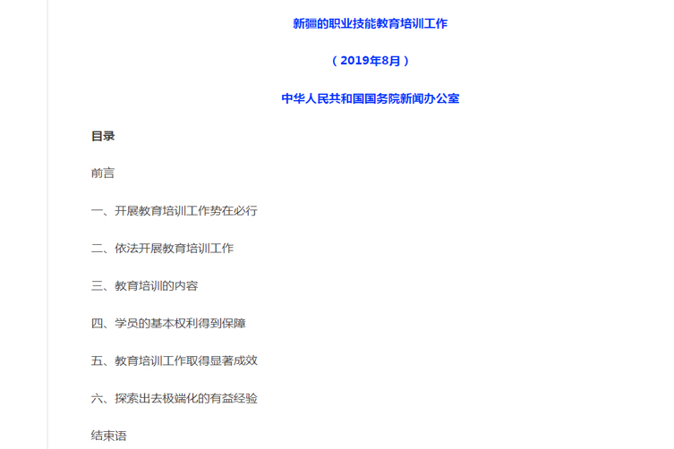 國務院新聞辦公室今日發表《新疆的職業技能教育培訓工作》白皮書。報告指新疆的教育培訓工作取得了反恐、去極端化鬥爭重要階段性勝利。