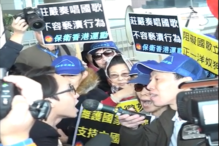 立法會今日進行《國歌條例草案》首讀及二讀,民陣及保衛香港運動成員在會外隔著鐵馬互相指罵。