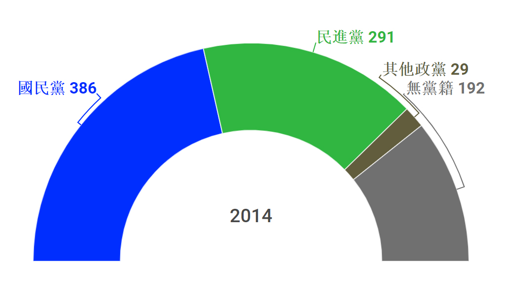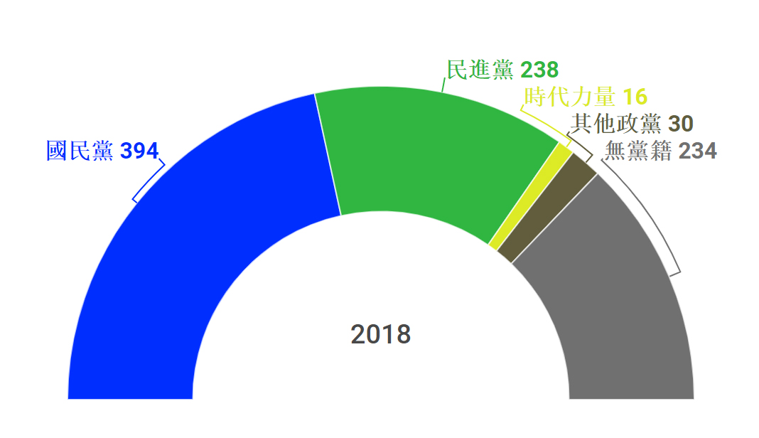 國民黨除了在縣市長選舉中大敗民進黨,更在大部分地方議會中成為最大黨,但整體上其席次終究不能過半。在6個直轄市中,國民黨在5個市議會中成為最大黨。而在其餘的縣市中,國民黨也成為9個縣的最大黨。總席次上,國民黨增加20席至394席,民進黨減少70席至238席,時代力量首度參選也取得16席,親民黨奪8席,其他黨籍也增加到22席,無黨籍增加42席至234席。