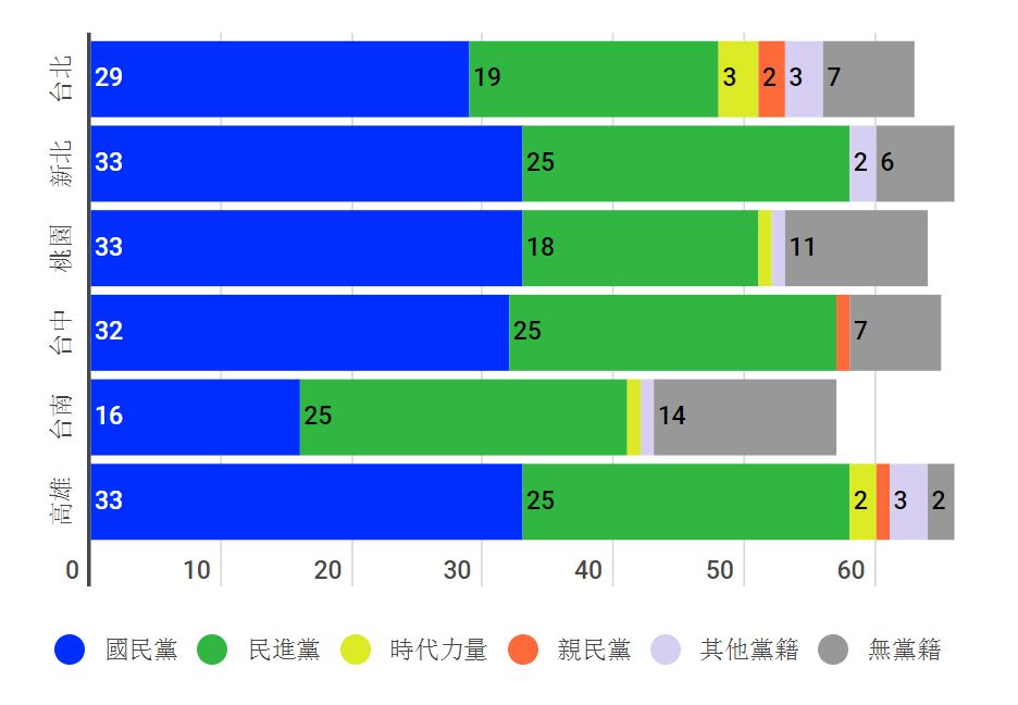 就以上所見,雖民進黨在直轄市長選舉中仍贏下2市,但6市中已有5個市議會由國民黨當最大黨,民進黨在6直轄市議會中控制國民黨市長當選人施政將會變得更難。但國民黨若徹底執政,必須聯合其他黨籍及無黨籍議員。
