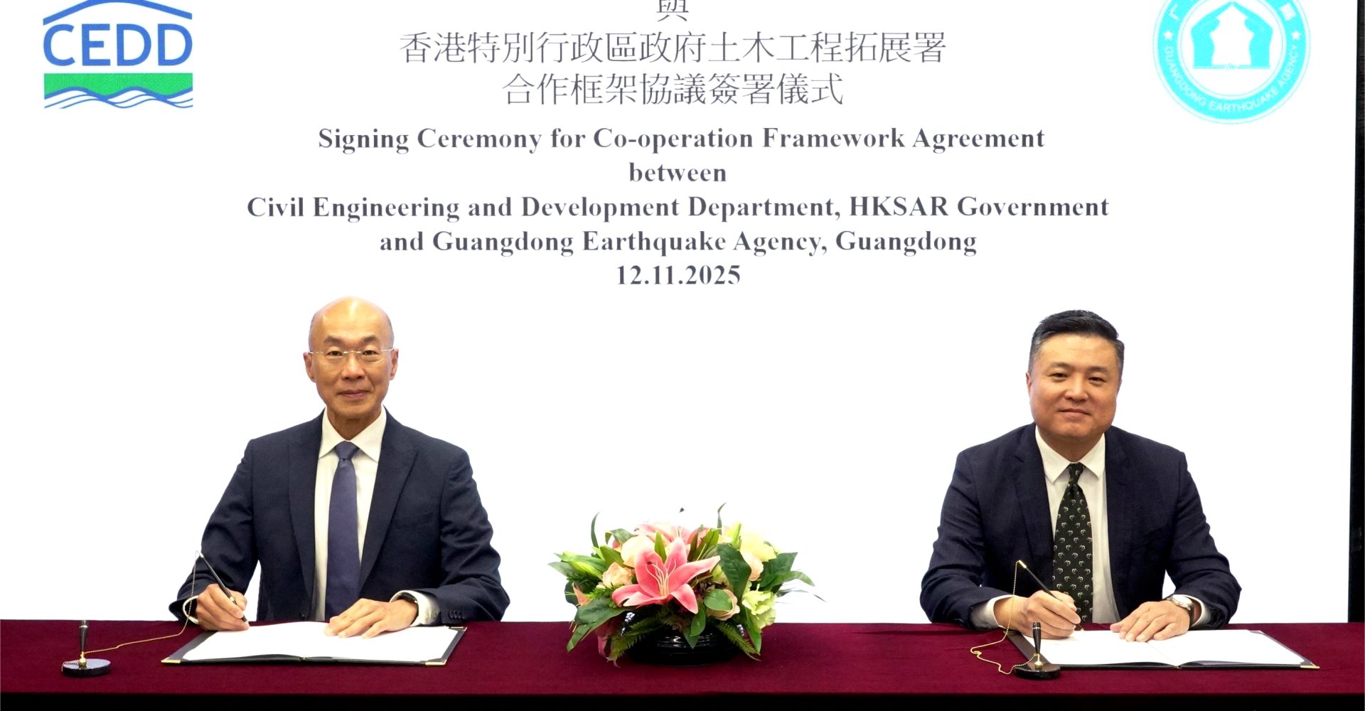 協議由土木工程拓展署署長方學誠,與廣東省地震局局長楊振宇簽署。