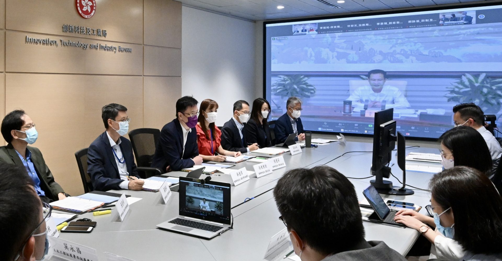 封面圖片:創新科技及工業局局長孫東(後左三)與深圳市委常委曾湃(八月二十五日)透過視像會議方式共同主持河套區港深創新及科技園發展聯合專責小組第九次會議。創新科技及工業局常任秘書長麥德偉(後左二)和創新科技及工業局副局長張曼莉(後左四)亦有出席會議。