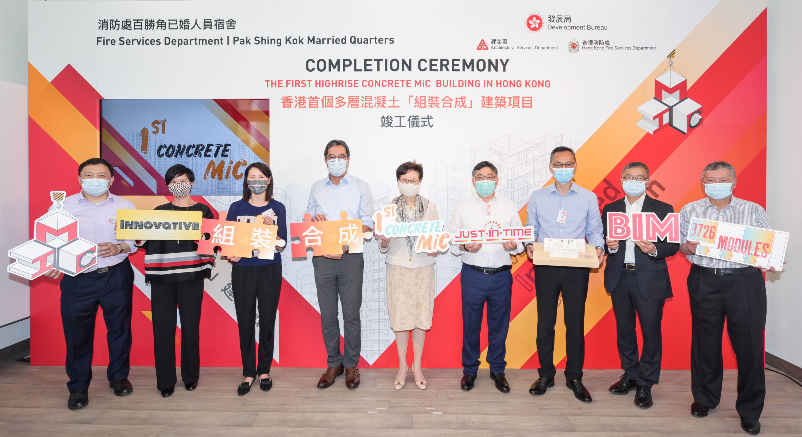 行政長官林鄭月娥(中)與發展局局長黃偉綸(左四)、發展局常任秘書長(工務)林世雄(右四)、保安局常任秘書長葉文娟(左三)、消防處處長梁偉雄(右三)、建築署署長何永賢(左二)、建造業議會主席陳家駒(右二)及嘉賓在儀式上合照。(政府新聞處圖片)