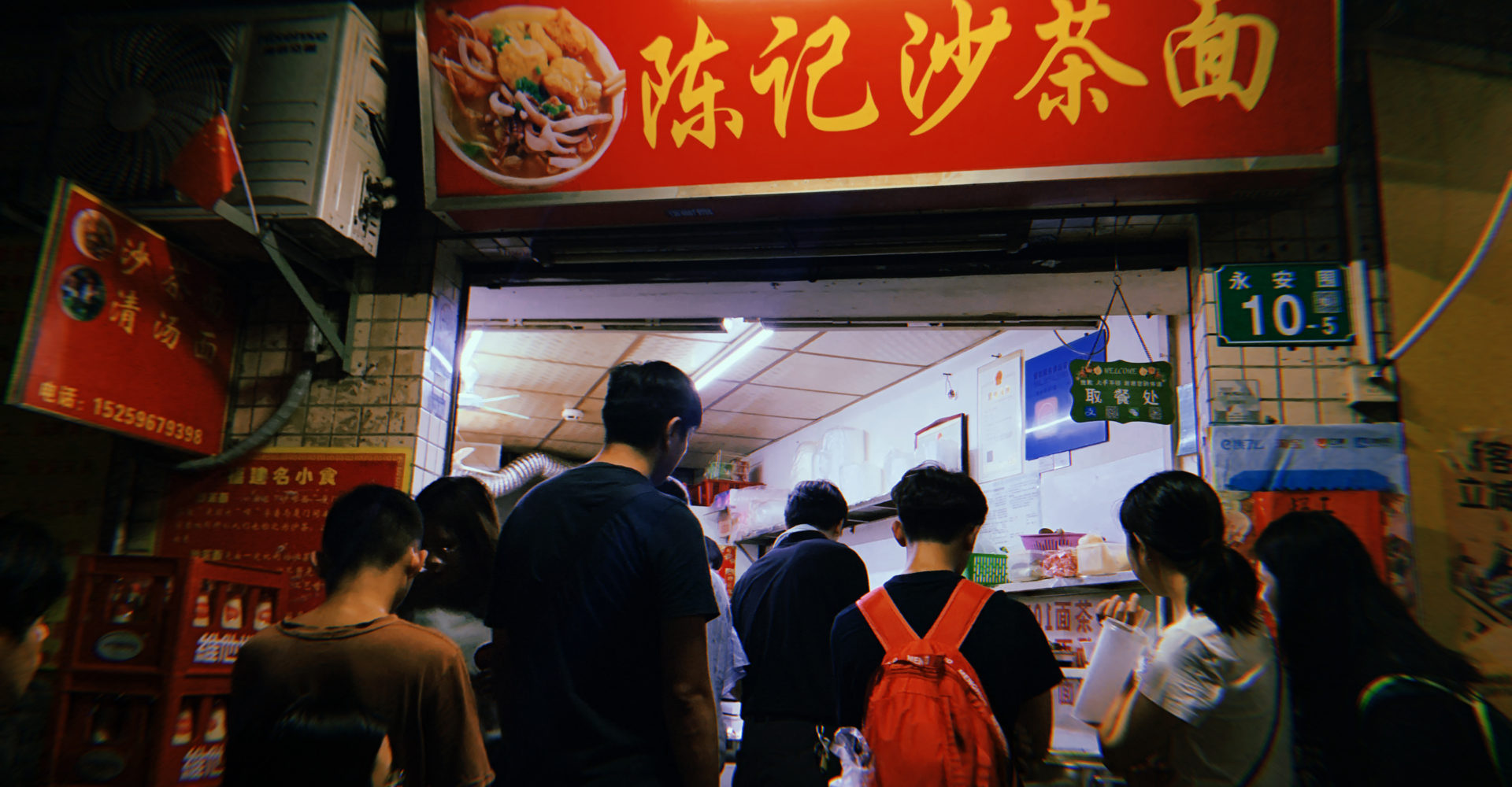 小店開在廣州的城中村的一條巷子裡,環境比較接地,一看就是那種「舊的很好吃」的樣子。迎面而來的就是簡潔明瞭的紅黃土味招牌「陳記沙茶麵」,起個灶就專注煮沙茶麵了。雖然環境一般,但貴在乾淨。店內很小,只有幾個位置,大多數的座位都是老闆娘幫你搬桌子搬椅子到馬路對面吃。雖然如此,但是每天到飯點,都會異常多人,門口排起長龍。