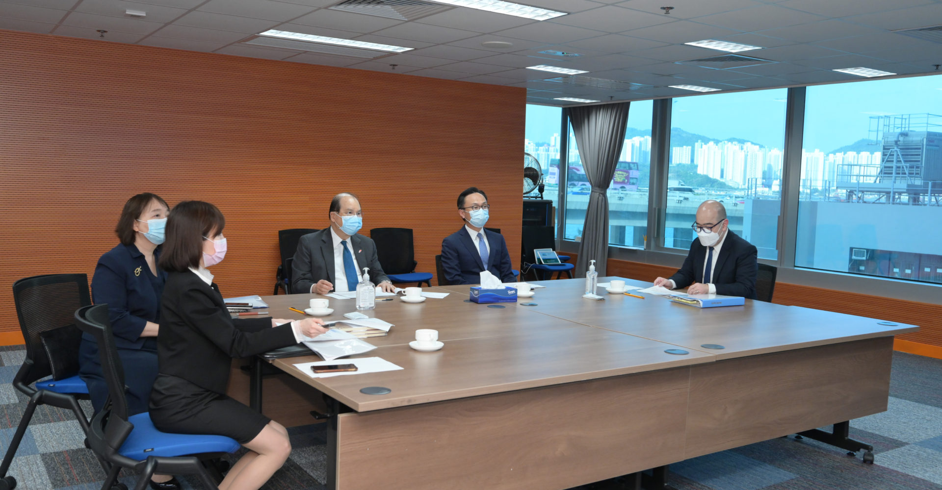 封面圖片:政務司司長張建宗(中)聽取公務員事務局副秘書長潘偉榮(右一)與培訓處同事介紹公務員學院的籌備進展。旁為公務員事務局局長聶德權(右二)。