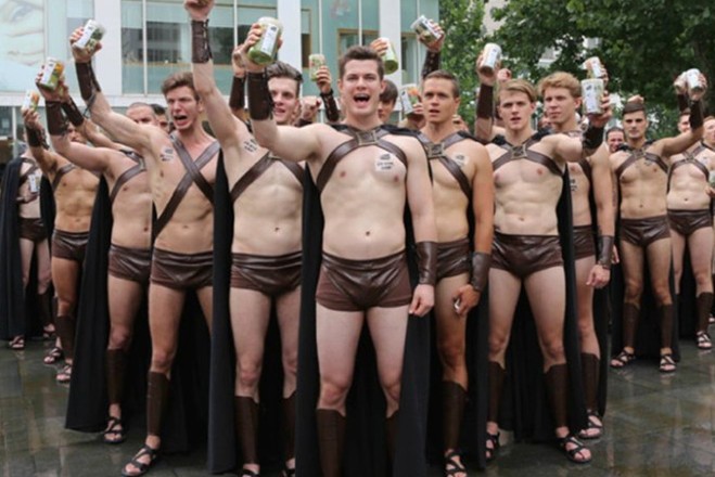 【本網訊】昨日北京朝陽區有一飲品公司請來過百個肌肉男在街頭當半裸勇士宣傳。百多名打扮成戰狼300的外籍男子,引來不少人圍觀,警方接報到場拘捕多名男模。