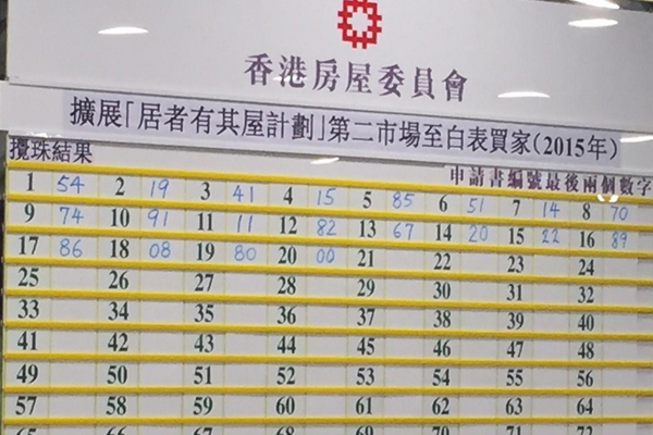 【本網訊】房委會公佈第二輪白表二手居屋攪珠結果,首20個按先後的揀樓次序為54、19、41、15、85、51、14、70、74、91、11、82、67、20、22、89、86、08、80、00。申請編號尾數為首11個號碼的家庭申請人,有機會取得資格證明書,屬於首個號碼的單身人士申請人亦肯定可取得證明書。在取得證明書後,申請人有一年時間揀樓。