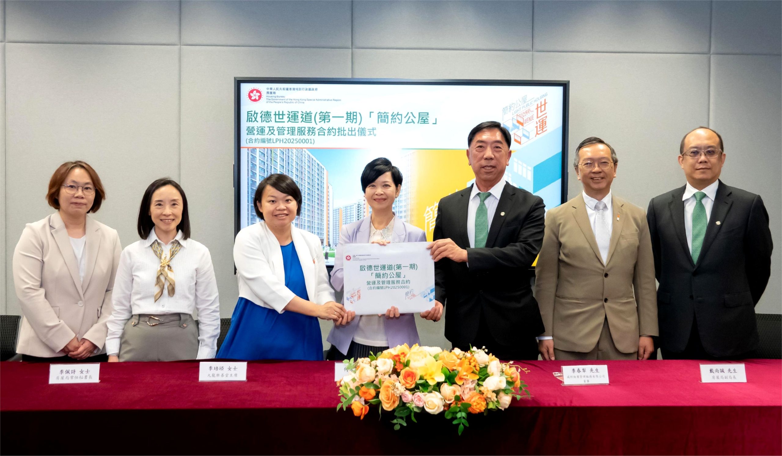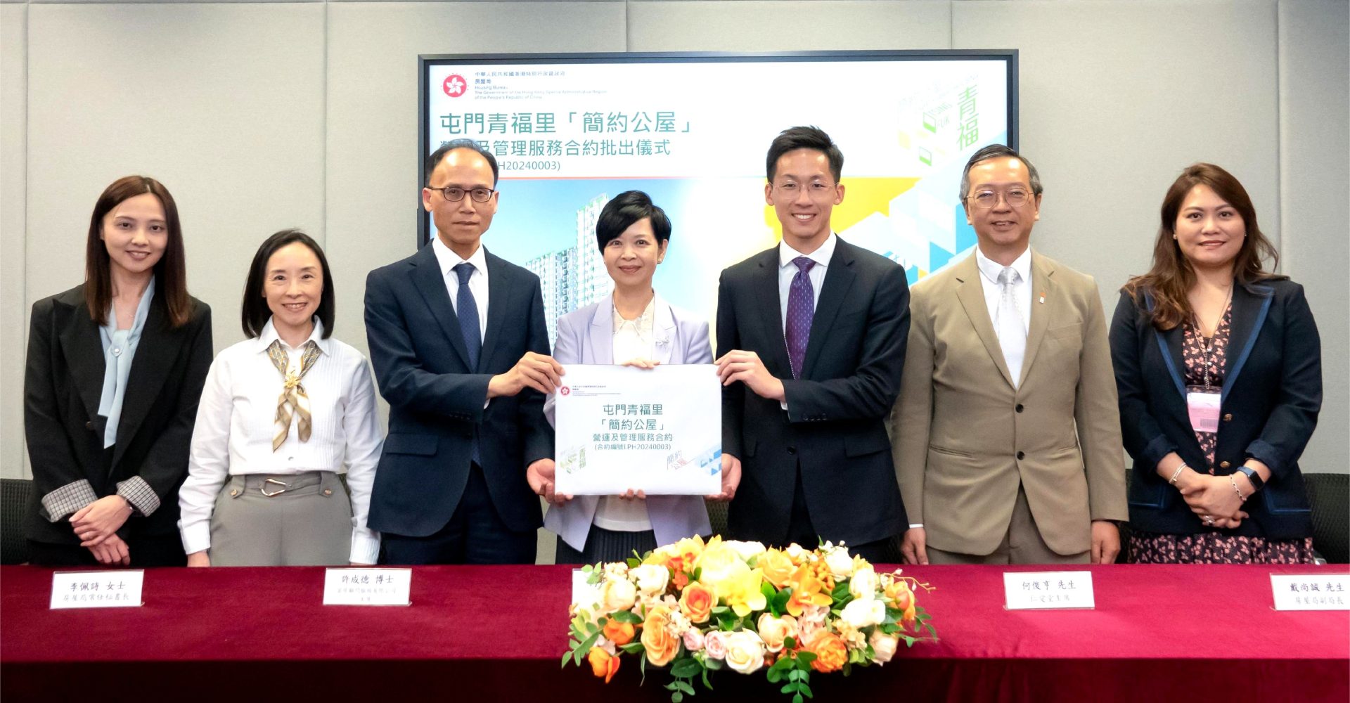 主圖片:房屋局局長何永賢(中)、房屋局常任秘書長李佩詩(左二)及房屋局副局長戴尚誠(右二)在批出合約的儀式上,與屯門青福里「簡約公屋」營運及管理服務合約的中標機構宜居顧問服務有限公司——仁愛堂有限公司聯營代表合照。
