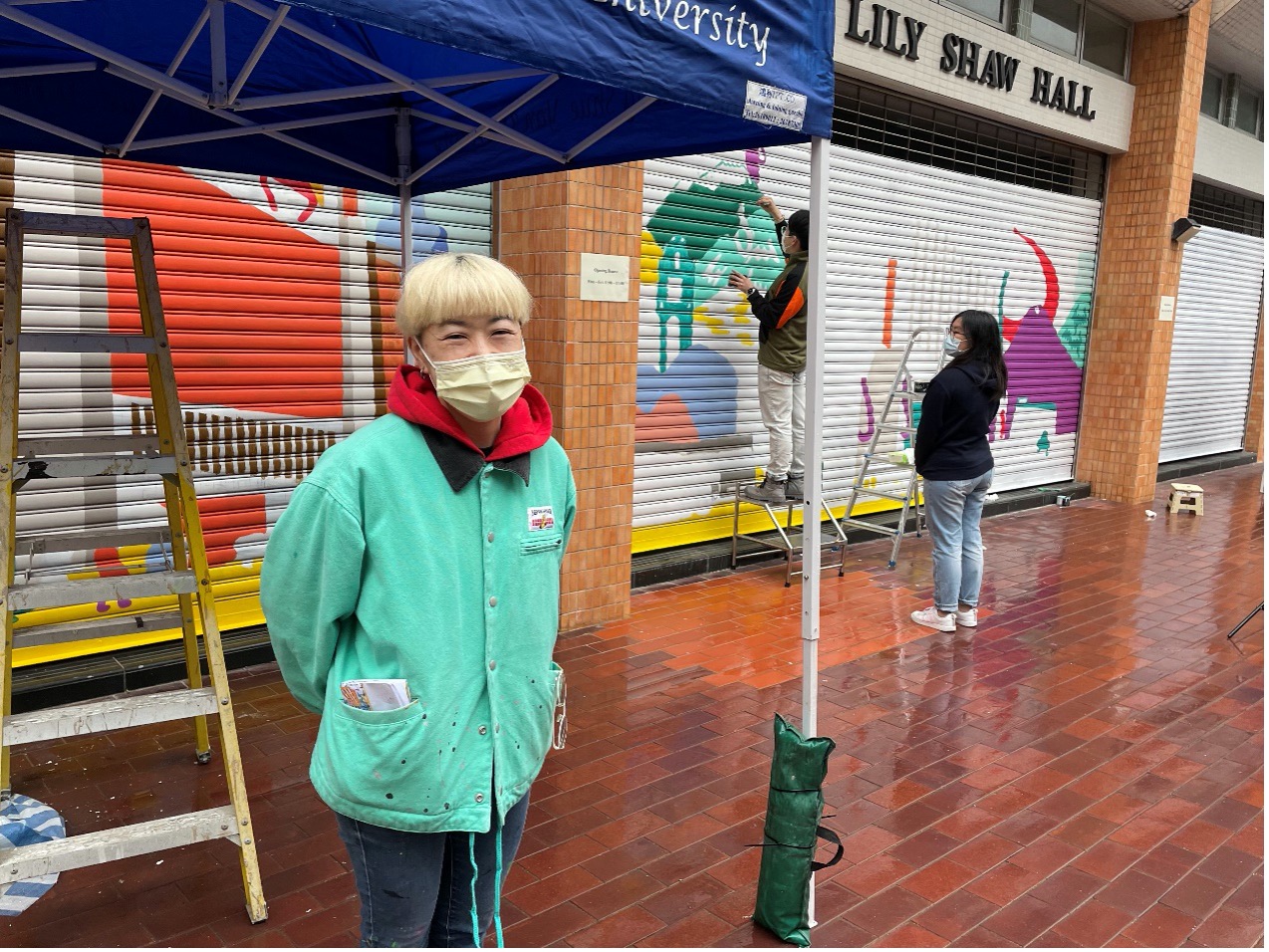 樹仁大學創校50周年,著名插畫師林雅儀(Zoie)與校方合作,帶領樹仁同學和員工於35週年廣場製作「鐵閘畫」,以橙、綠作為主色,繪畫校園生活點滴。