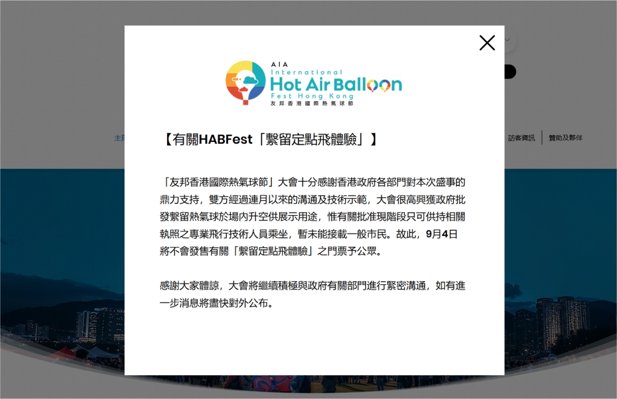 「友邦香港國際熱氣球節」於今日至7日舉行。主辦機構在熱氣球節網站公布,熱氣球在場內只會作升空展示用途,政府只批准持有相關執照的專業飛行技術人員乘坐熱氣球,暫未能接載一般市民。「9月4日將不會發售有關『繫留定點飛體驗』之門票予公眾」。