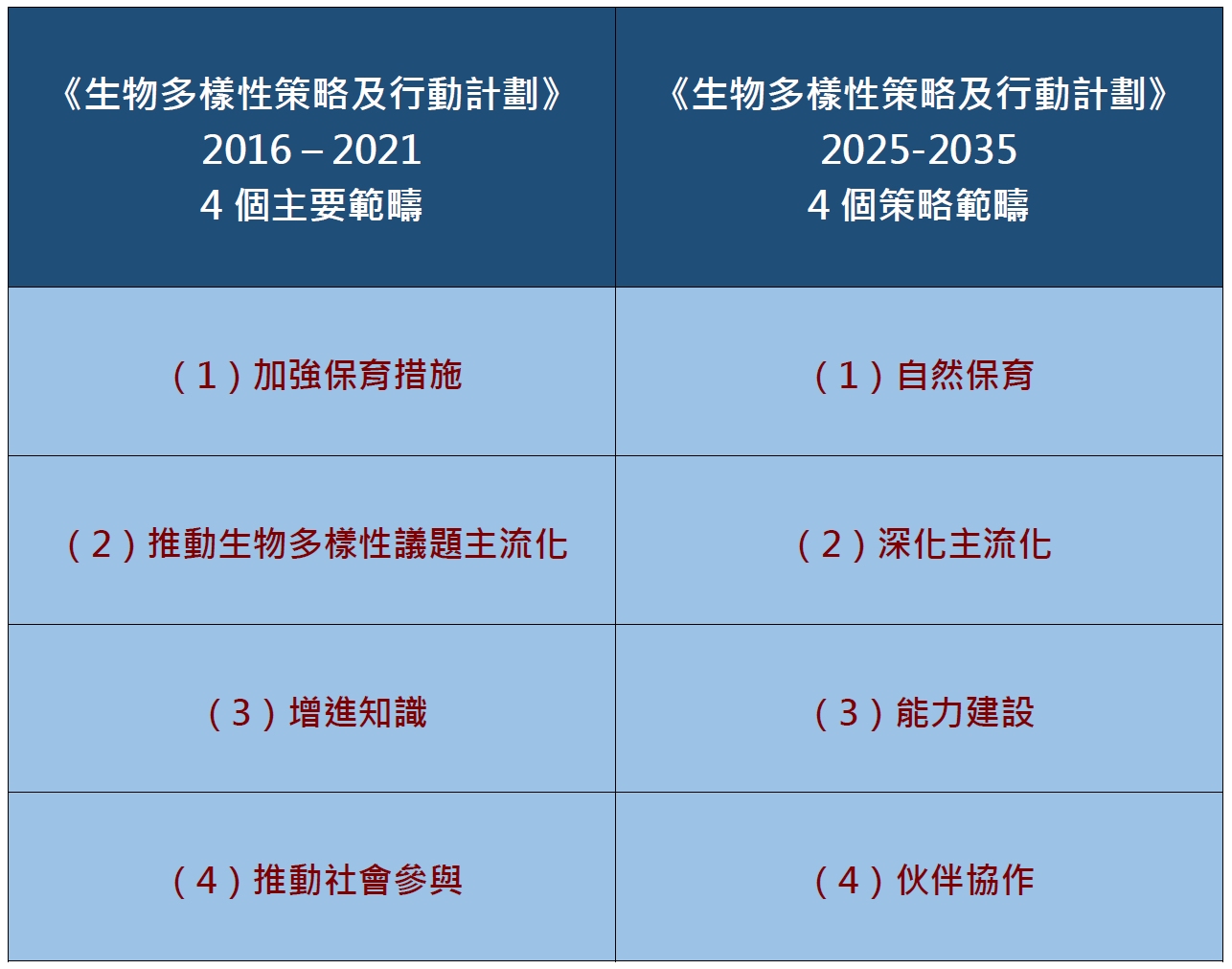 政府今日公布更新2016年公布的香港《生物多樣性策略及行動計劃》,闡明未來10年香港為保護自然生態,和支持可持續發展採取的策略及優先行動。當中有兩項策略範疇修訂,包括把2016年的「增進知識」改為「能力建設」,以及把「推動社會參與」修改為「伙伴協作」(見下表)。