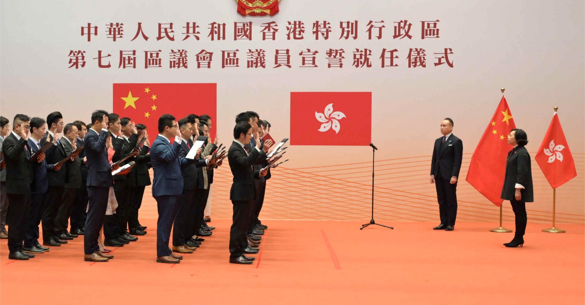 新一屆區議會全體470名區議員今日在政府總部會議廳,參加宣誓就任儀侙,由獲得行政長官授權的民政及青年事務局局長麥美娟監誓。