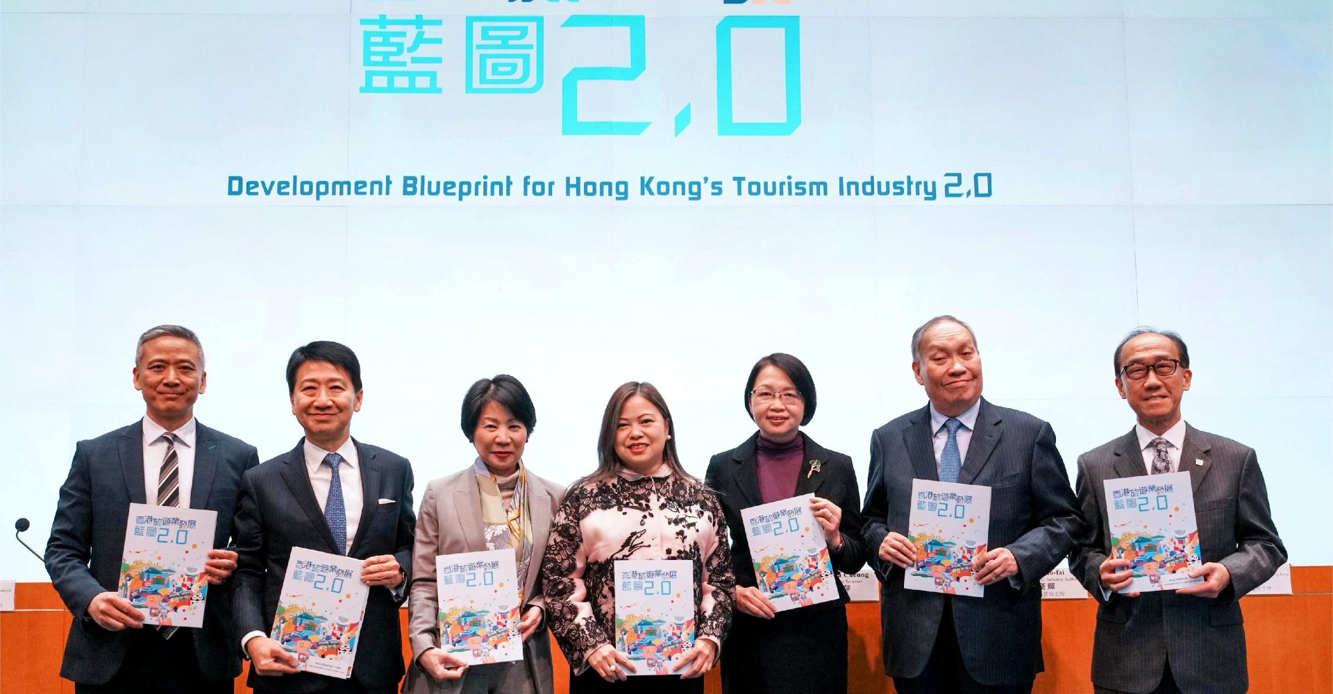 主圖片:文化體育及旅遊局今日公布《香港旅遊業發展藍圖2.0》。左起:立法會議員(旅遊界功能界別)姚柏良、香港旅遊發展局主席彭耀佳博士、文體旅局常任秘書長沈鳳君、文體旅局局長羅淑佩、旅遊事務專員張馮泳萍、旅遊業監管局主席馬豪輝、香港旅遊業議會主席譚光舜。