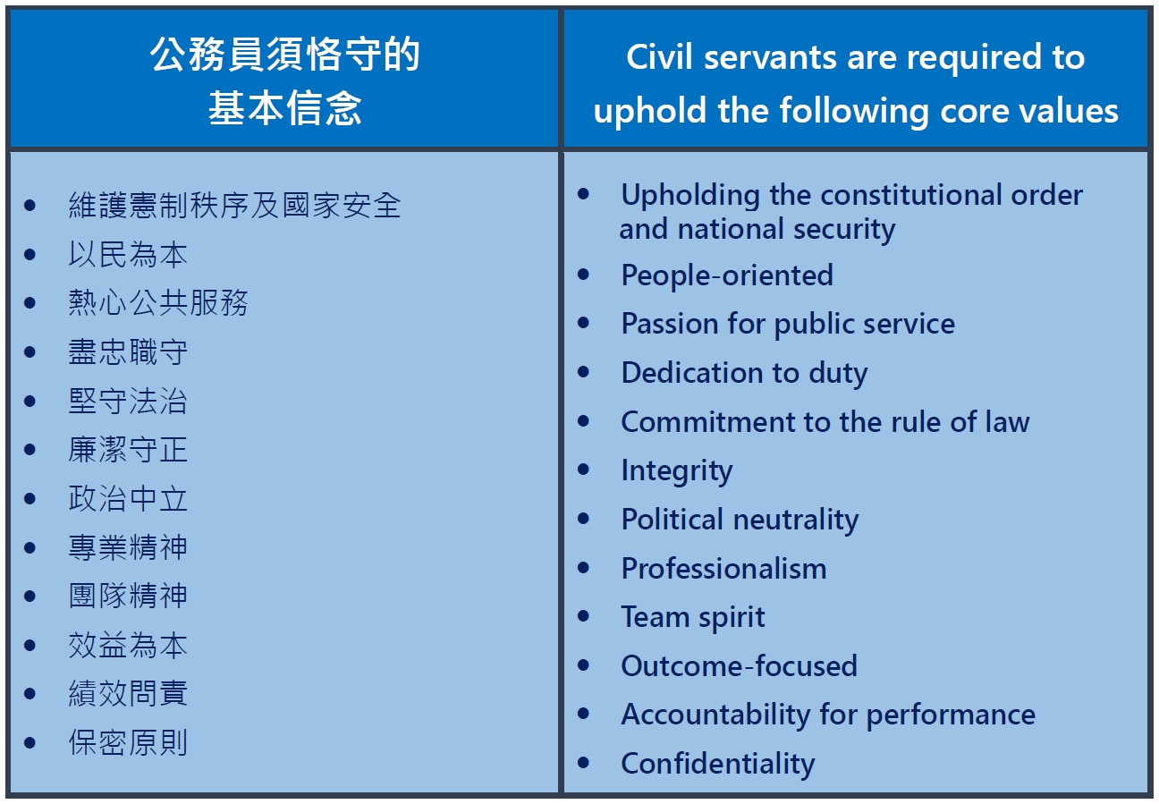 公務員事務局今日向全體公務員發出通告,頒布更新版《公務員守則》,開列出12項公務員須共同恪守的基本信念(見下表),排第一位的是「維護憲制秩序及國家安全」。