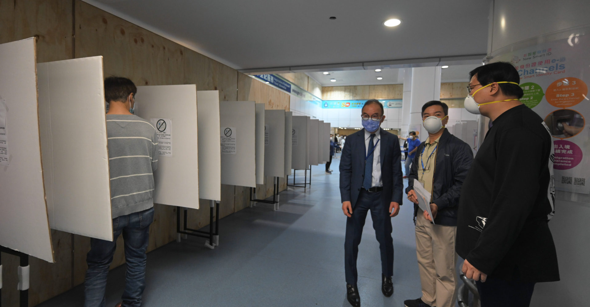封面圖片:政制及內地事務局局長曾國衞(右三)在羅湖邊境管制站投票站視察投票間的設計
