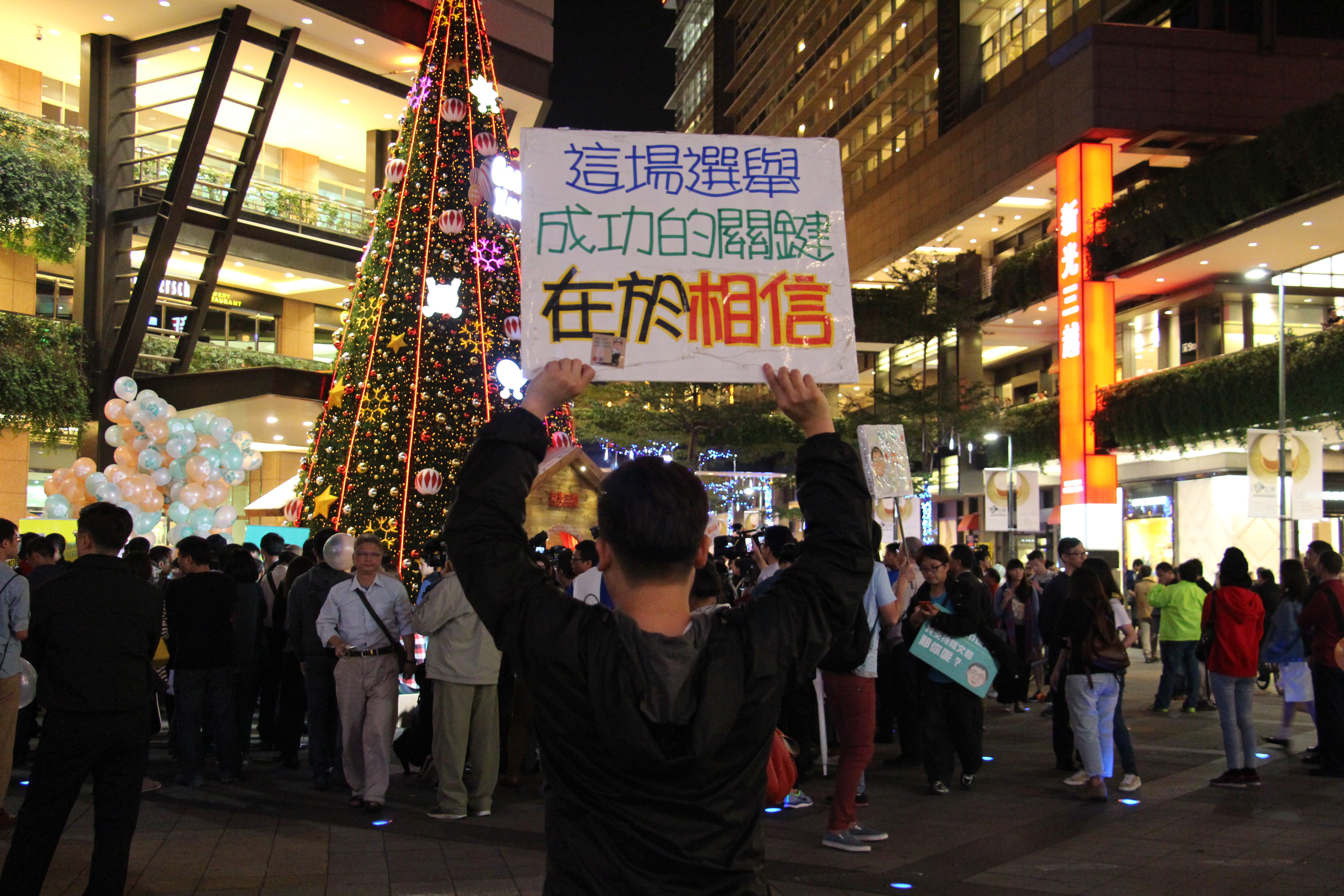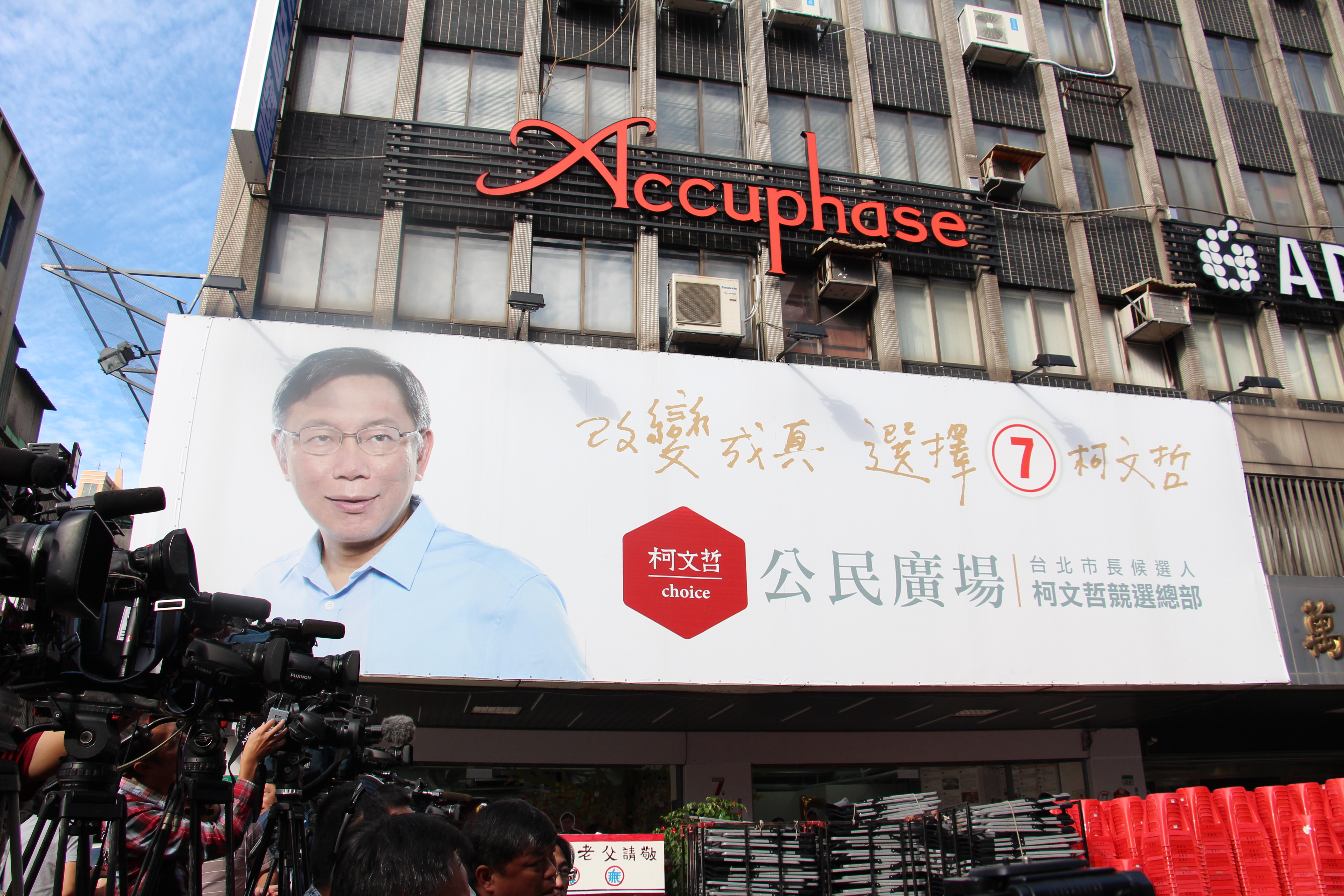 柯文哲競選總部外牆的巨型橫幅,以吸引支持者。