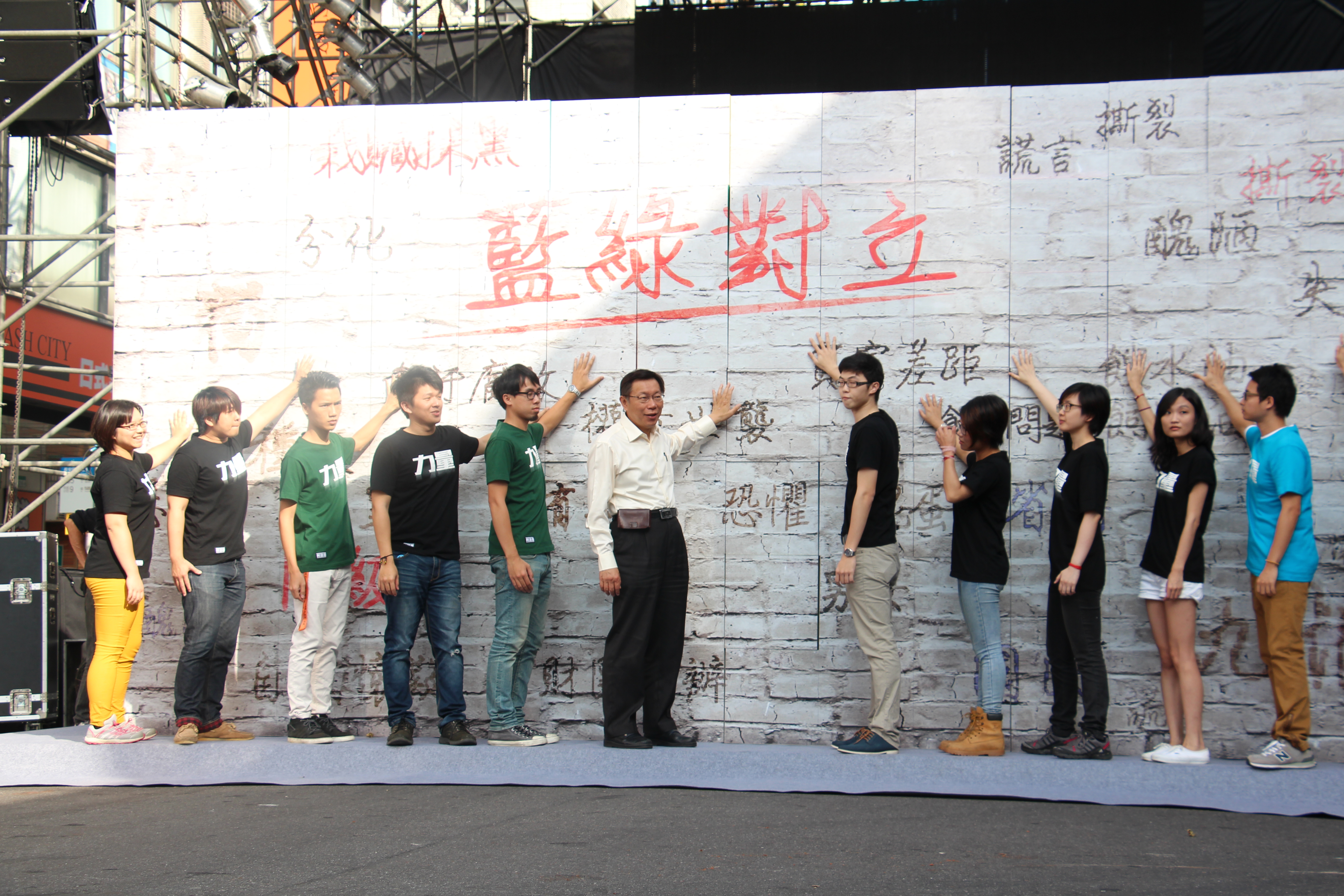 柯文哲聯同年輕支持者一同推倒象徵社會上不公義的高牆。