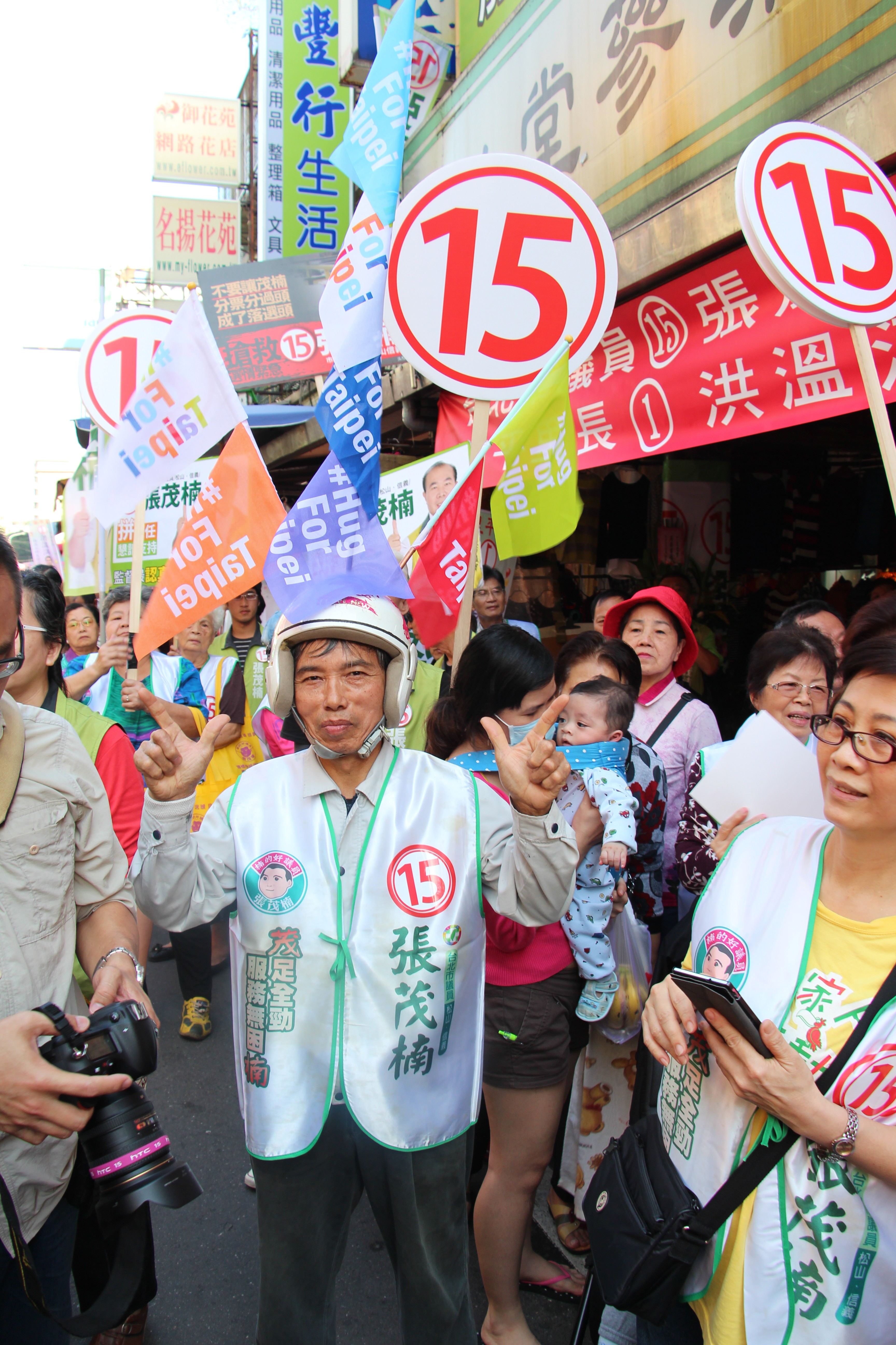 柯文哲本身也有不少人替他助選,圖為里長參選人舉起7號手勢聲援柯P。