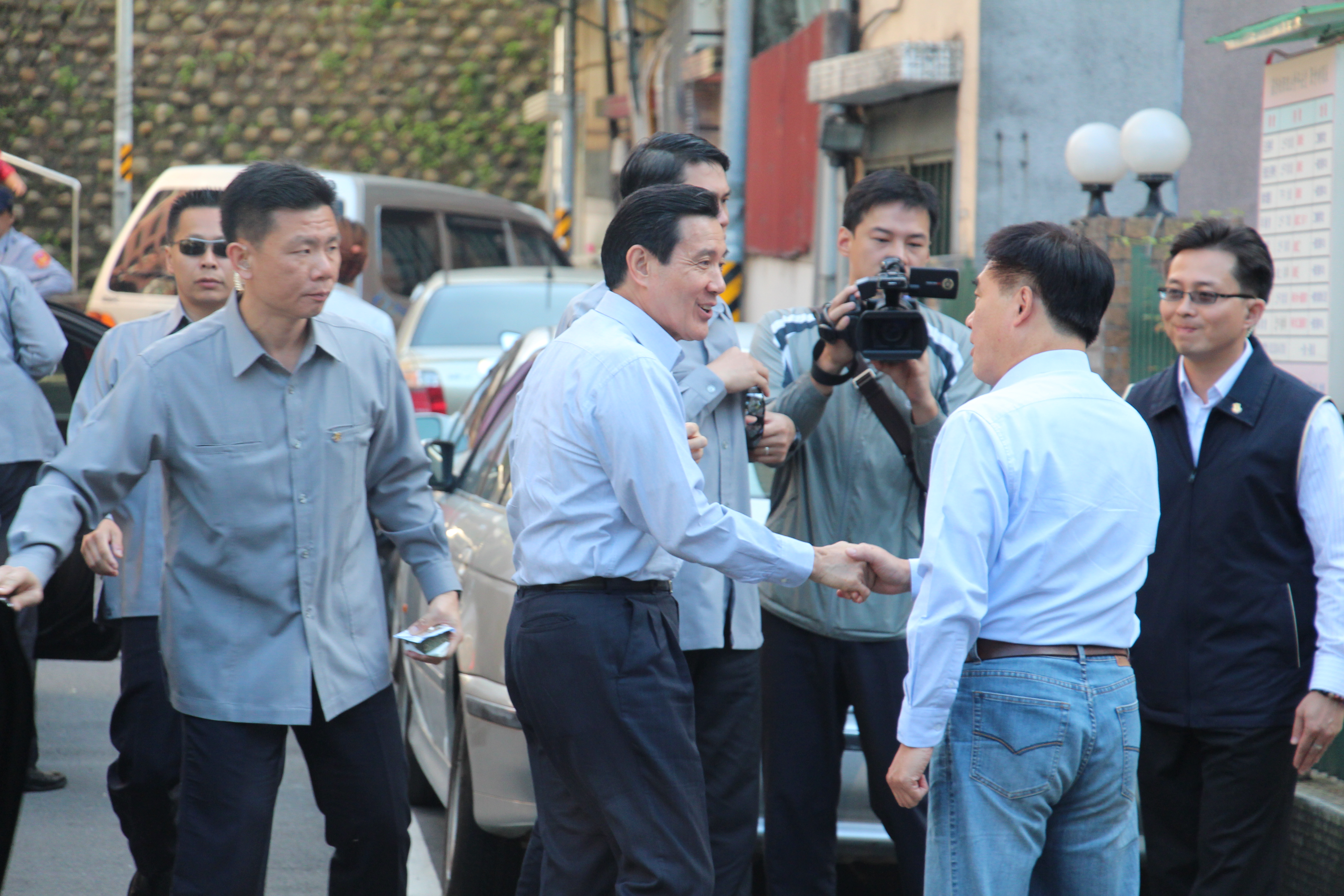 被指與馬英九不和的台北前市長郝龍斌,在投票站外迎接總統,兩人握手氣氛良好。