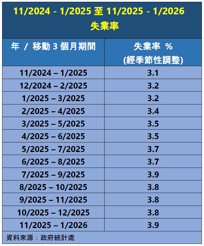 根據政府統計處今日發表的最新勞動人口統計數字,經季節性調整的失業率由2025年10月至12月的3.8%,上升至2025年11月至2026年1月的3.9%。就業不足率在該兩段期間則保持不變,維持於1.7%的水平。