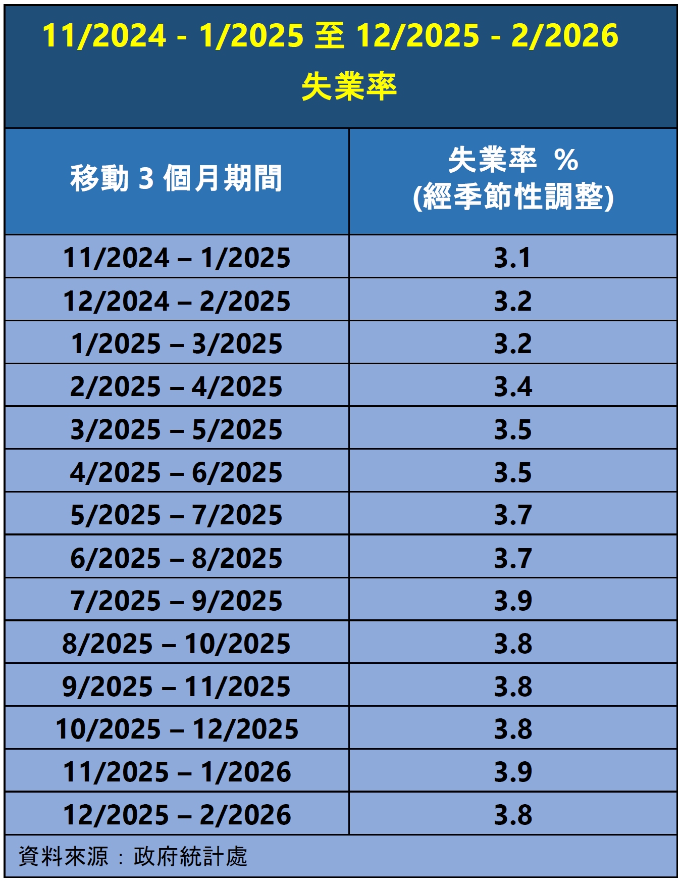 根據政府統計處今日發表的最新勞動人口統計數字,2025年12月至2026年2月經季節性調整的失業率為3.8%,比2025年11月至2026年1月的3.9%,微跌0.1個百分點;就業不足率則保持不變,維持在於1.7%的水平。