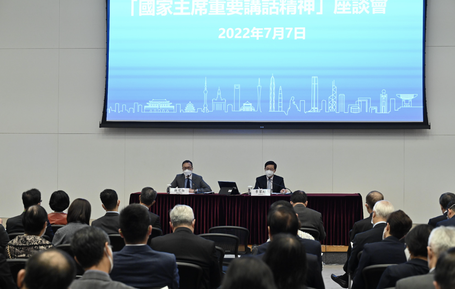 封面圖片:公務員事務局在政府總部舉辦「國家主席重要講話精神」座談會,由行政長官李家超(台上,右)主講,律政司司長林定國(台上,左)在座談會上分享感受。