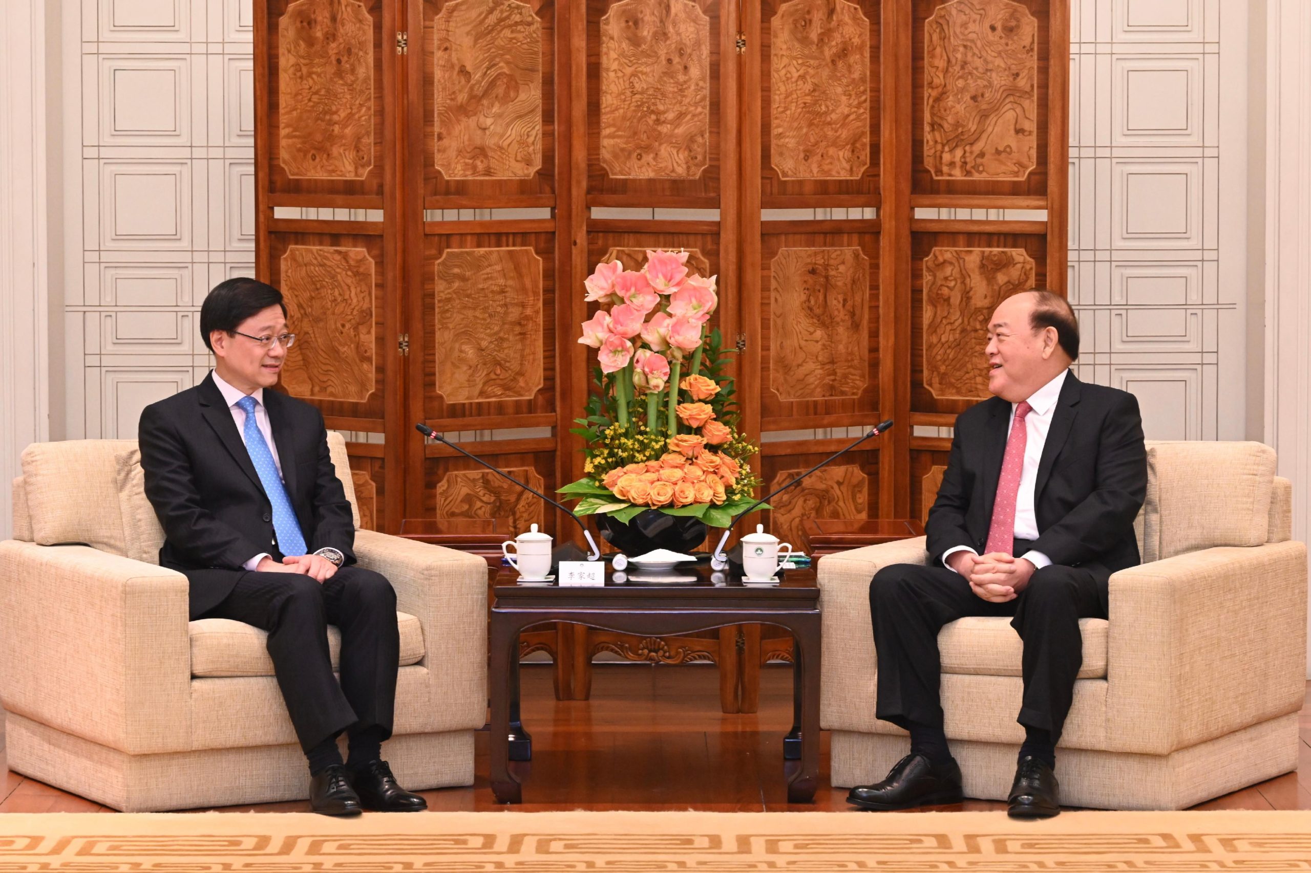 李家超之後前往澳門特區政府總部,與賀一誠會面,就推展港澳合作、攜手推進粵港澳大灣區高質量發展作深入交流。