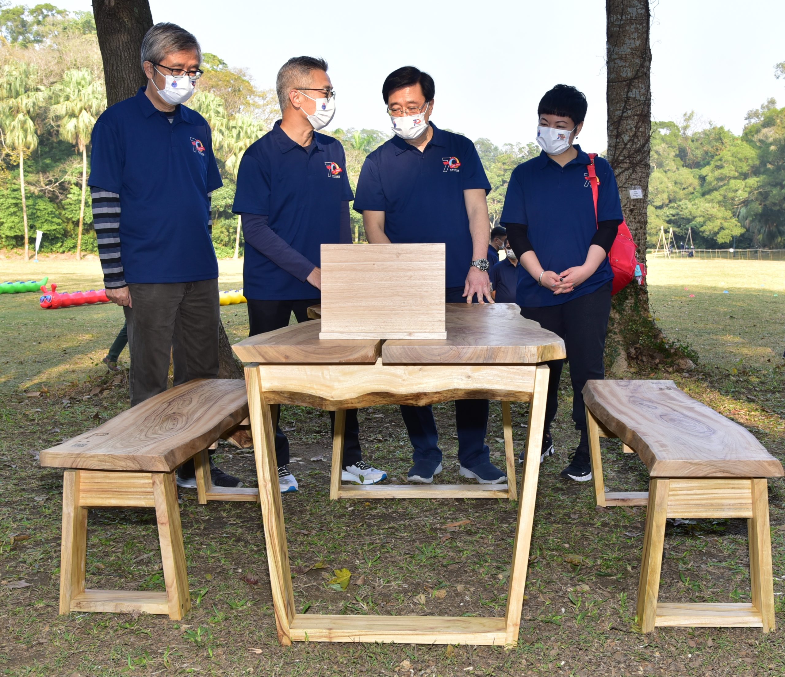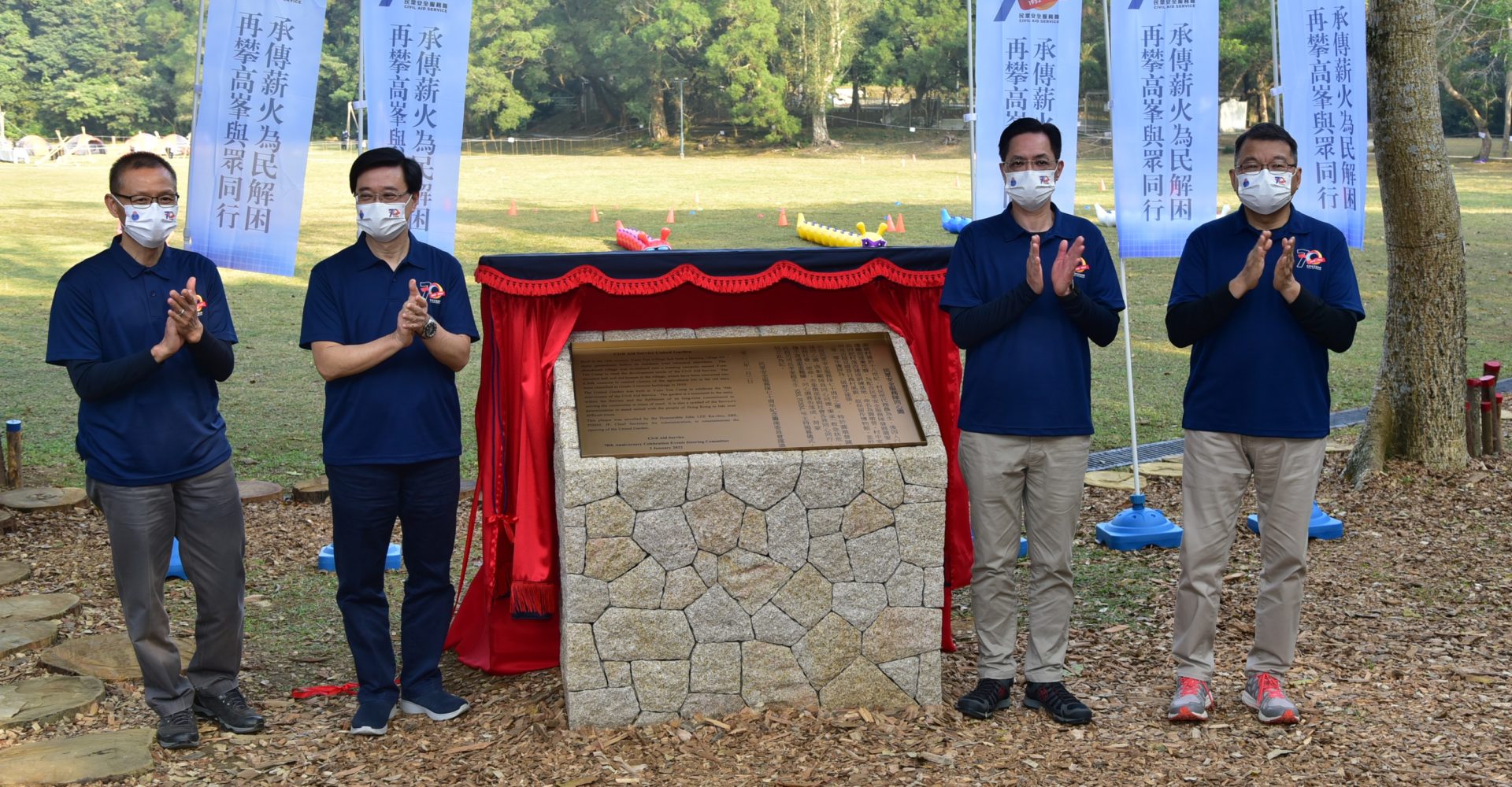 封面圖片:政務司司長李家超(左二)、民眾安全服務隊(民安隊)處長羅仁禮(右二)、民眾安全服務處總參事方耀堂(左一)與民安隊成立70周年慶祝活動籌委會主席林國興(右一)主持揭幕儀式。