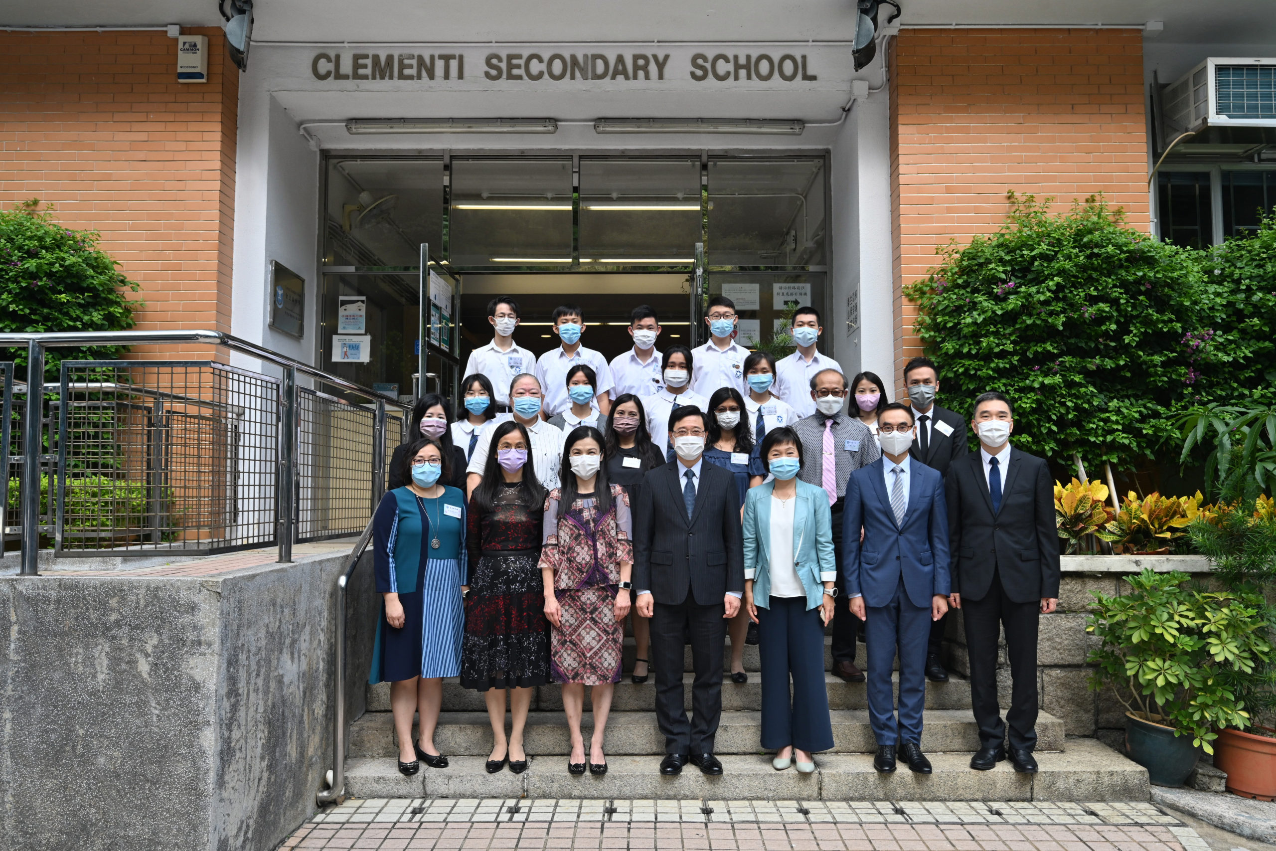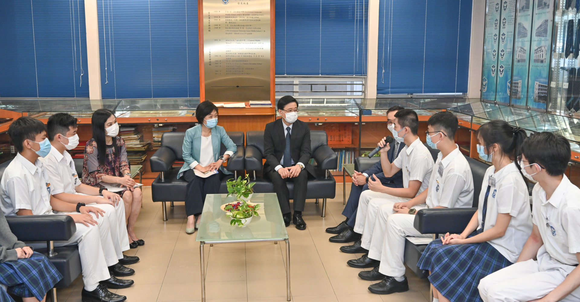 封面圖片:政務司司長李家超(中)在教育局副局長蔡若蓮(左四)及金文泰中學校長馮黎妙儀(左三)陪同下,聽取學生參與國慶日慶祝活動及其他公民教育相關學習經歷後的感想。