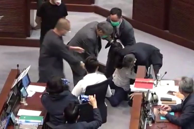 立法會內務委員會今日(8日)於會議室1召開兩場會議,在教育事務委員會會議約1時14分結束後,現任內會主席李慧琼在立法會保安保護下坐上主席台位置,並於2時半開始會議。 民主派及建制派多名議員繼續包圍主席台,現場一度混亂,議員朱凱廸、陳志全、許智峯、尹兆堅及譚文豪先後被逐出會議,大批保安員先後將朱凱廸、陳志全及譚文豪抬離會議廳 。
