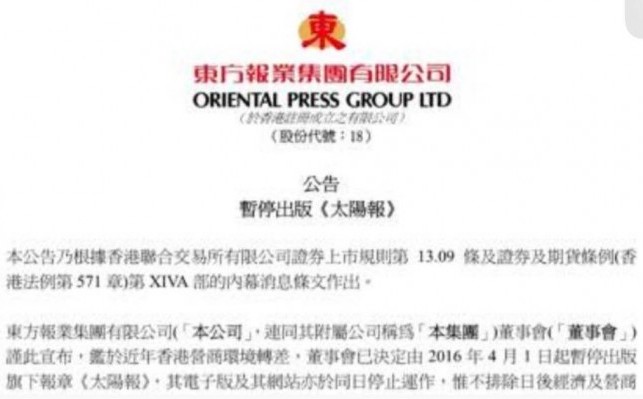 新聞熱話港聞 東方報業宣佈暫停出版太陽報 March 29, 201601122 【本網訊】東方報業集團(018)宣佈,鑑於近年香港營商環境轉差,董事會決定由下月1日起,暫停出版旗下報章《太陽報》,其電子版及其網站亦於同日停止運作,惟不排除日後經濟及營商環境改善後復刊。 因應《太陽報》暫停出版,東方報業集團將重整資源,致力強化其他業務之發展。董事會認為暫停出版《太陽報》並不會對該集團之財政狀況構成重大不利影響,並符合公司及其股東最佳利益。 Related Related tags : 太陽報東方報業 食藥監總局:4方面跟進事件 Previous Post 紐約中央公園現特朗普假墓碑 Next Post