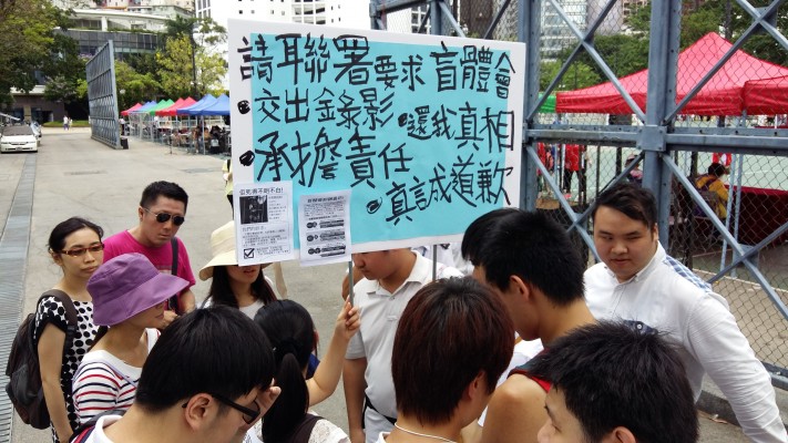 盲人足球員林榮順在球賽後暴斃案,林榮順關注小組到維園盲人體育總會舉辦的一個嘉年華中示威,圍繞足球場一圈,其間叫口號提出三點訴求:要求盲體會交出事球賽的現場錄影帶,讓專業人士確認死因;交待事件來龍去脈;就該會邀請靈媒到林家「通靈」讓家屬相信他死於「醫療疏忽」事件道歉。繞場其間,一名盲體會男義工向關注組成員高呼「收聲」及「返屋企」。