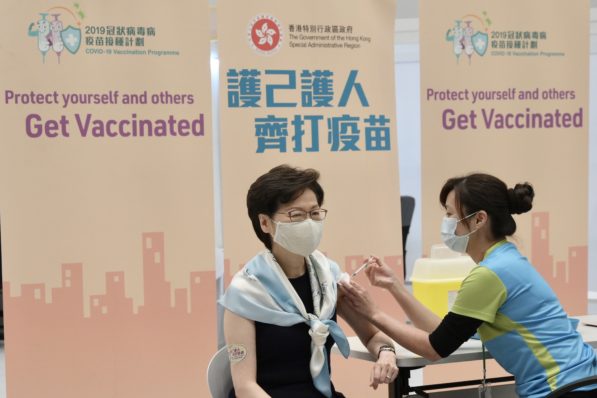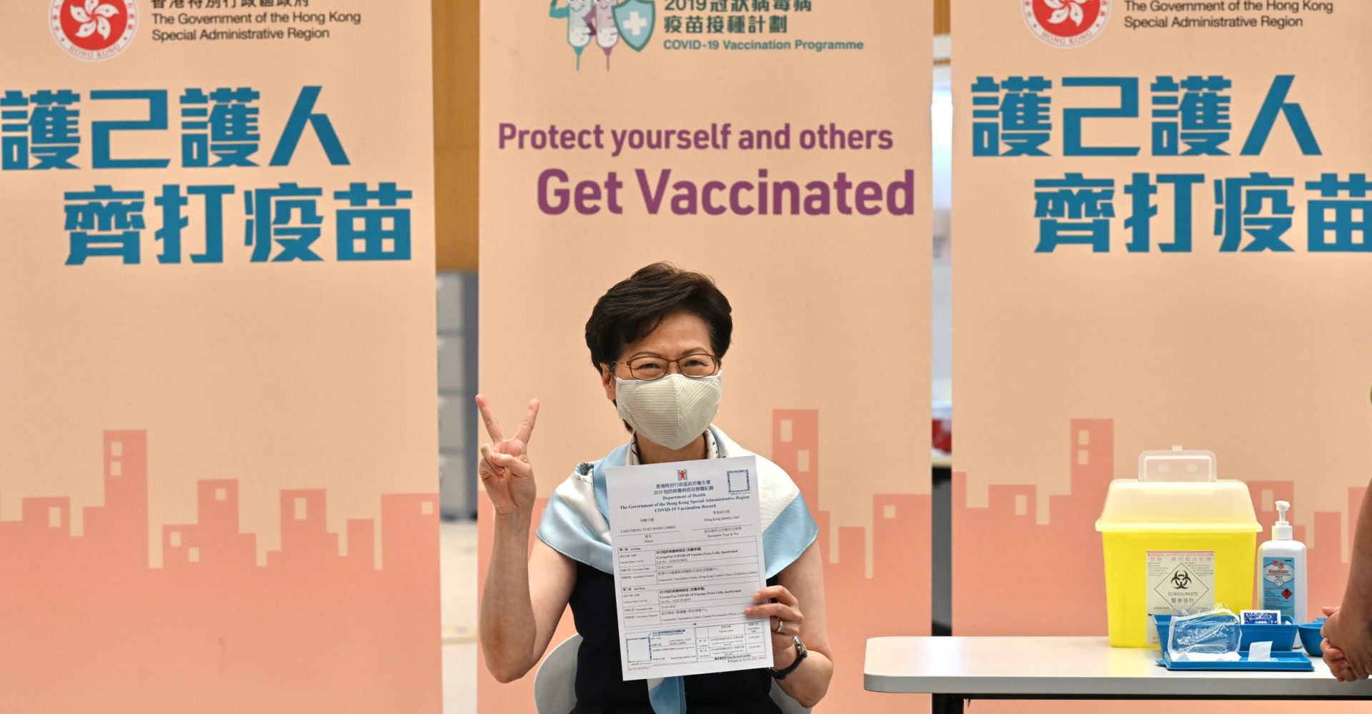 行政長官林鄭月娥與多名主要官員在政府總部接種第二劑科興新冠疫苗,並呼籲市民及早預約及接種,護己護人。