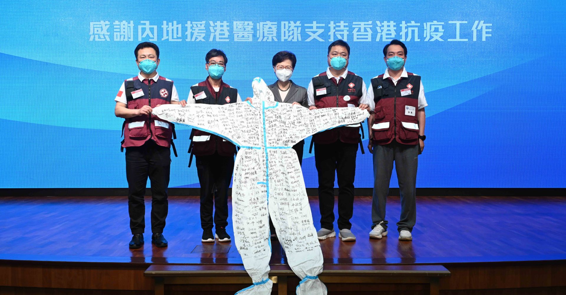 行政長官林鄭月娥致辭時表示,感謝內地援港醫療隊在特區疫情最嚴峻的時刻加入救治病人的戰線,充分體現一方有難、八方支援的無私精神,以及血濃於水的同胞情誼。她又指出,當局不會掉以輕心,會貫徹落實「外防輸入、內防反彈」的策略,打好和打贏抗疫戰。