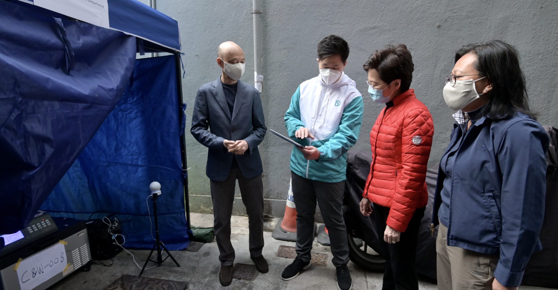 林鄭月娥在早上(15日)先到渠務署在中西區的污水井採樣點,視察工作人員採樣的流程。她感謝渠務署同事和合約承辦商默默支援抗疫,每天要在極短時間通知下到選定的污水井進行連續數小時的戶外採樣,以配合研究團隊的工作。