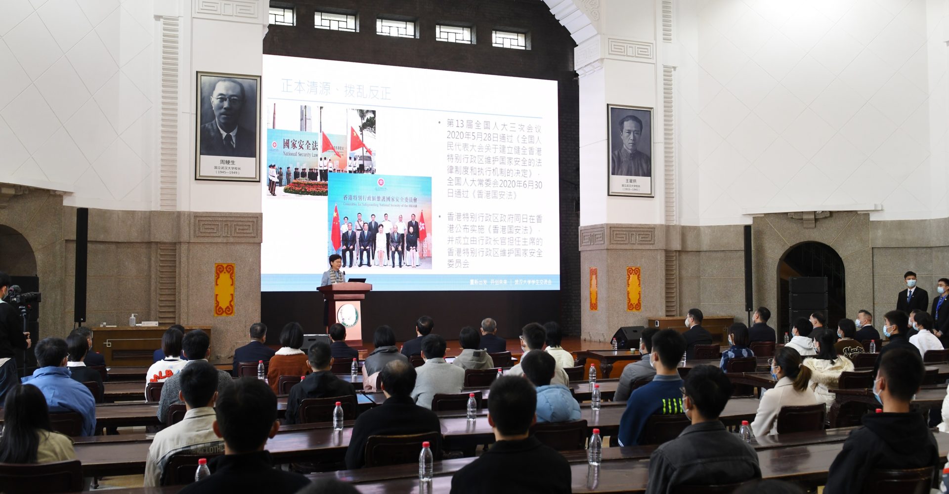 林鄭月娥向武漢大學70多位同學演講,介紹香港最新情況。她說過去兩年,特區在中央支持下,制定實施《香港國安法》和完善香港選舉制度,令香港重回「一國兩制」正軌,落實「愛國者治港」,迎來新局面。她說香港會致力發揮其優勢,並善用中央的支持,積極提升經濟動力和發展新產業,把握國家「十四五」規劃的機遇,融入國家發展大局。