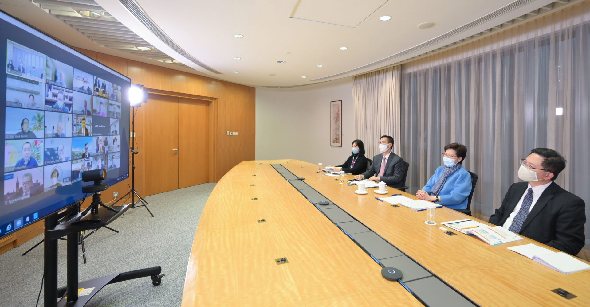 封面圖片:行政長官林鄭月娥(右二)透過視像會議與大學教育資助委員會成員會面,就高等教育界的最新發展交換意見。教育局局長楊潤雄(左二)、創新及科技局局長薛永恒(右一)及教育局常任秘書長李美嫦(左一)亦有出席。