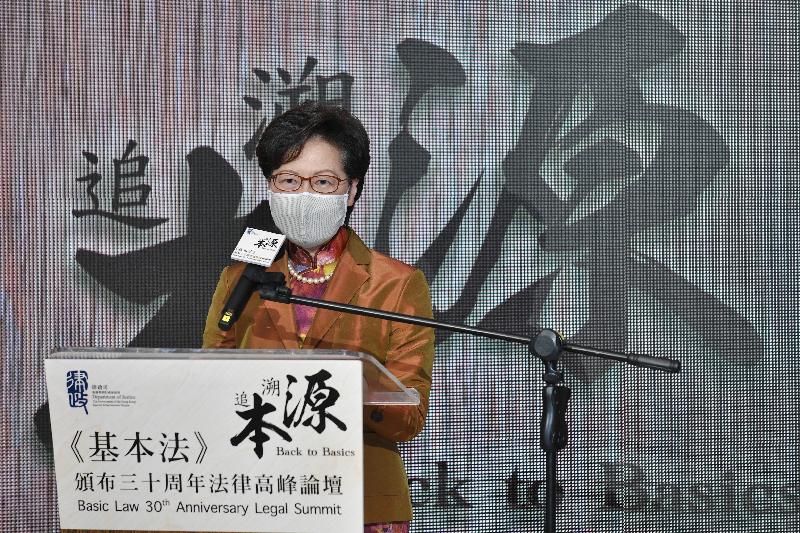 行政長官林鄭月娥今(17日)出席《基本法》頒布30周年法律高峰論壇上表示,香港在過去數個月香港出現兩個不能自行解決的憲制性問題,包括立法會選舉押後而出現真空期問題,以及4名早前被選舉主任裁定不擁護《基本法》,不效忠中華人民共和國香港特別行政區立法會議員延任資格的問題。她稱,兩次請求中央提請人大從憲制層面解決問題,強調做法符合憲法和《基本法》規定,有理有據,不容外國政府或政治組織抹黑詆毀。