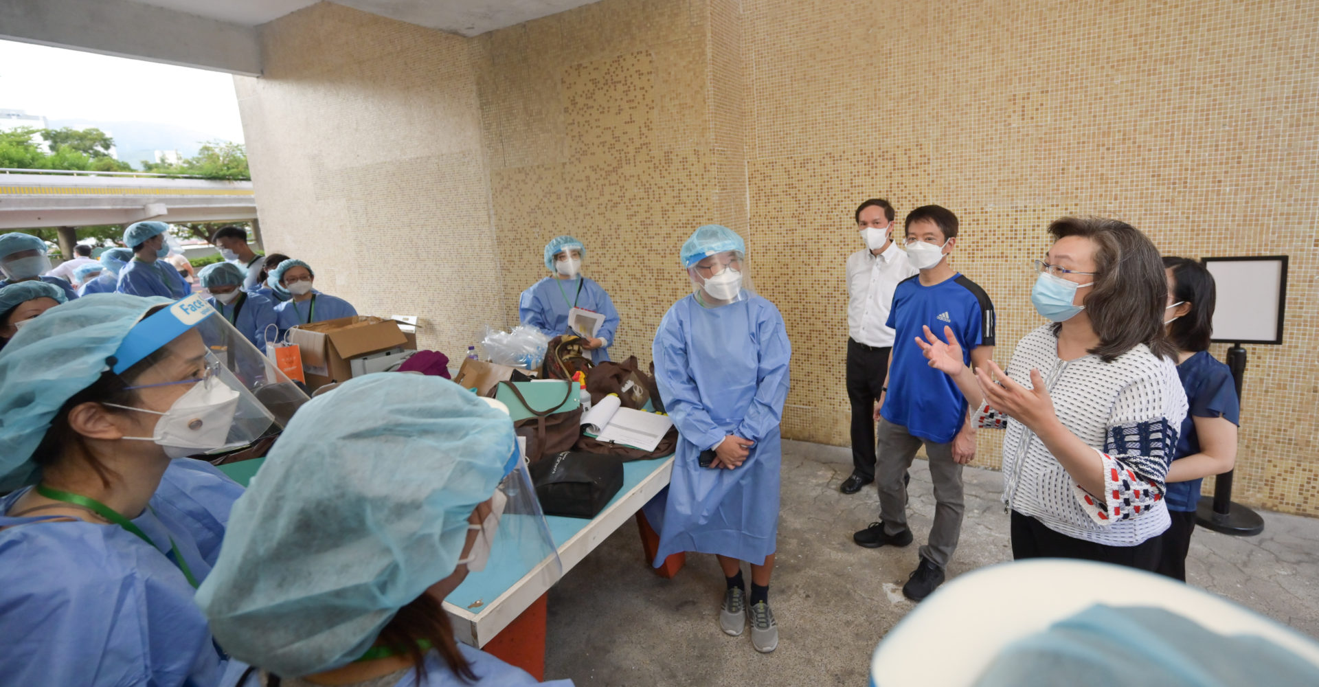 封面圖片:公務員事務局(七月二十六日)下午開始在青衣青泰苑通泰閣執行「圍封強檢」行動。公務員事務局局長楊何蓓茵(右)為同事打氣。