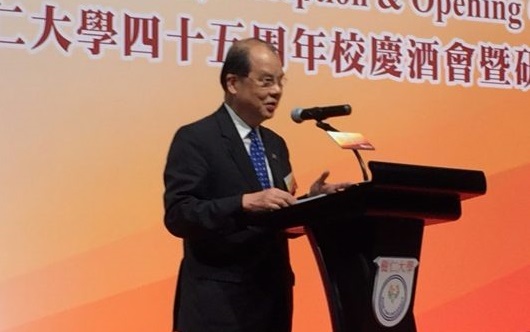 香港樹仁大學下午慶祝創校45週年校慶暨研究院綜合大樓開幕,雙喜臨門,主禮嘉賓政務司司長張建宗卻形容,應該是「三喜臨門」。