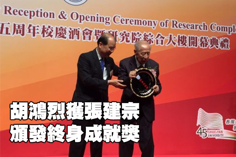 張建宗致辭說:「我擔任教育副統籌司時(1996-1999),經常與校監胡鴻烈和已故校長鍾期榮碰面,他們都是尊敬的學者……他們以無私奉獻的精神,創辦樹仁,春風化雨,是毅力、信念和勇氣的展現,給胡先生頒這個獎,實至名歸。」之後,張建宗便給胡鴻烈頒發「終身成就獎」,正是他所說的「第三喜」,全場掌聲雷動。